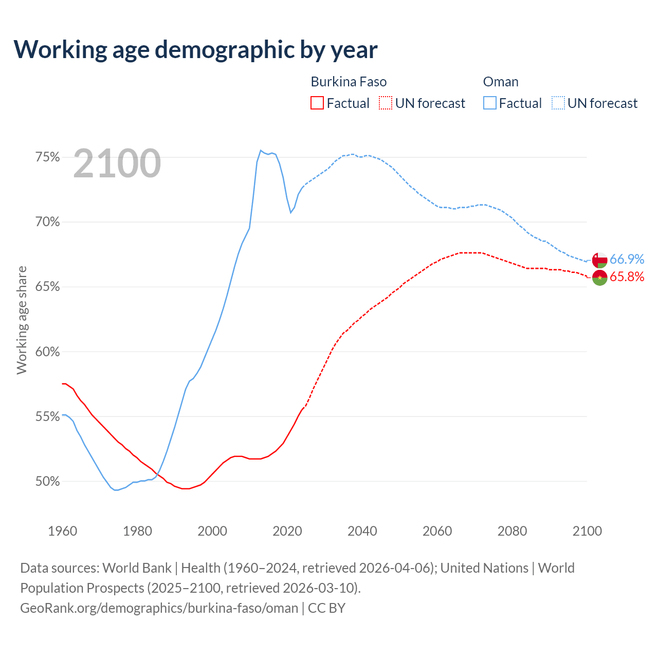 - Burkina Faso has 13.8M working age adults (aged 15-64) vs 4.19M in Oman.