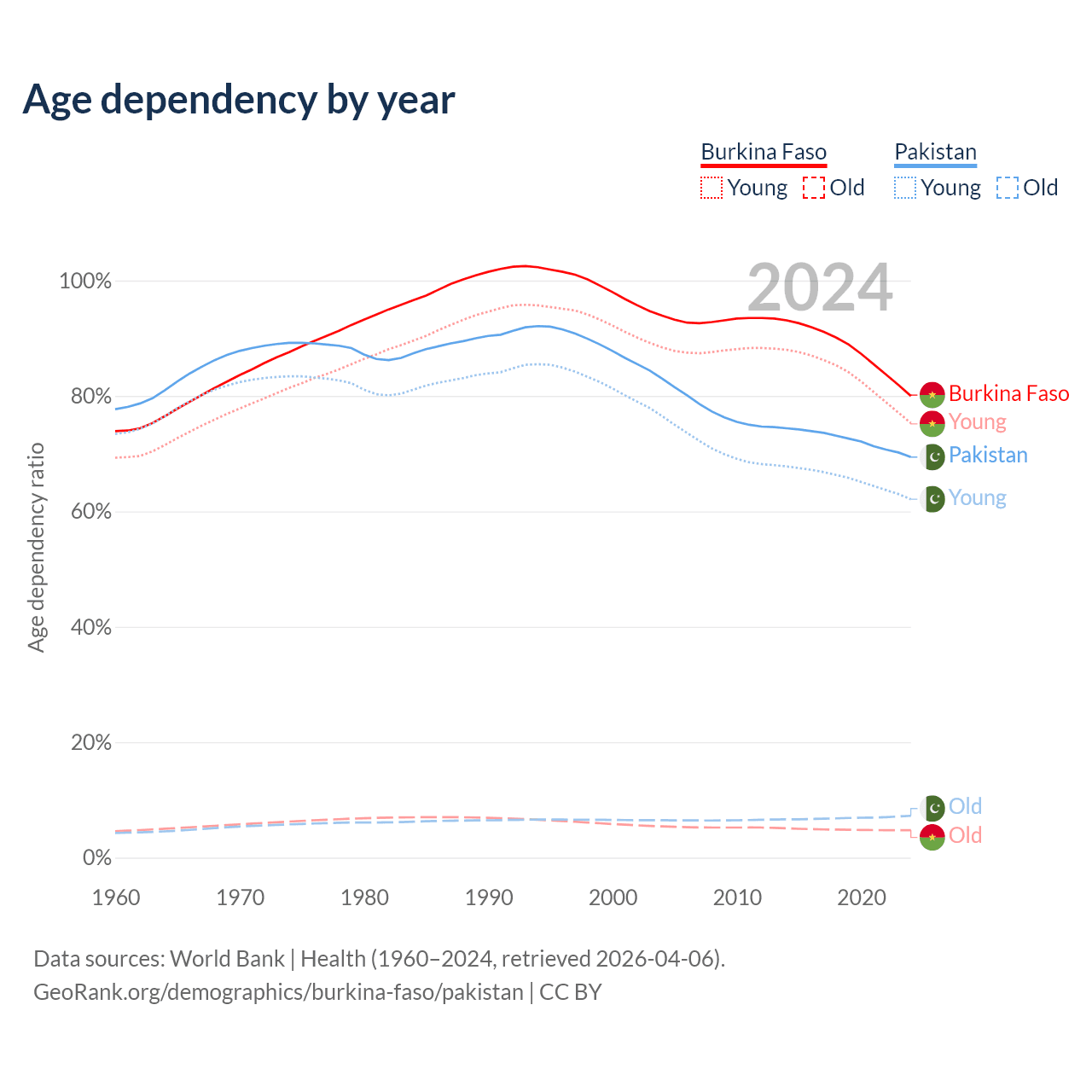 - Burkina Faso is ranked 183/196 by median age (oldest to youngest) vs 154/196 for Pakistan.