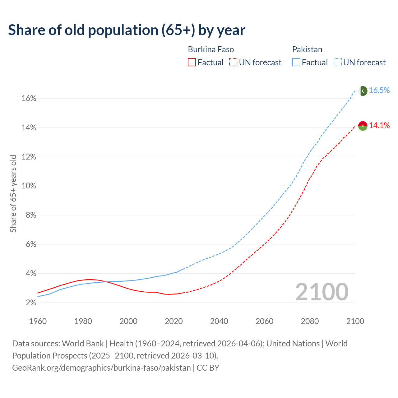 The share of older people aged 65 and over is 2.65% in Burkina Faso and 4.28% in Pakistan. Life expectancy in Burkina Faso compared to Pakistan .