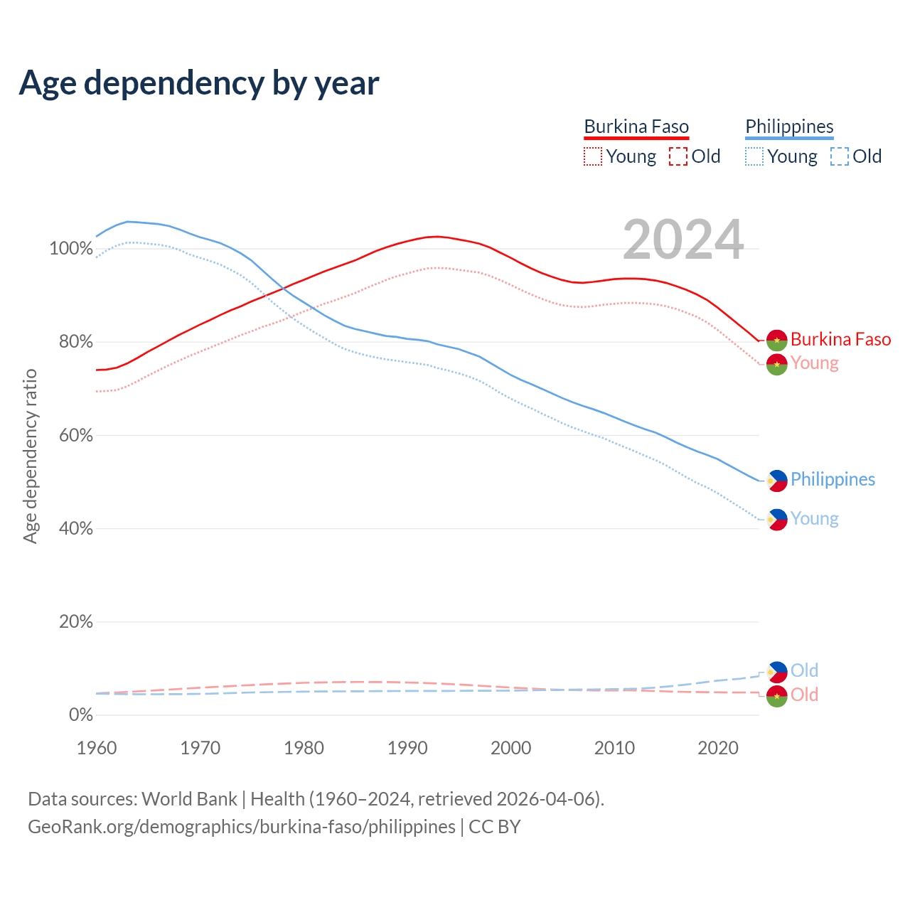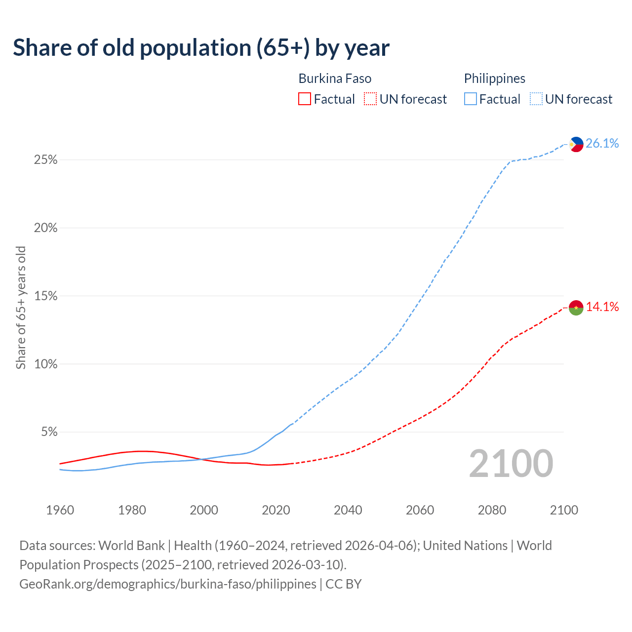 - The share of old-age demographic (65+) in Burkina Faso is 2.65% vs 5.49% in the Philippines.