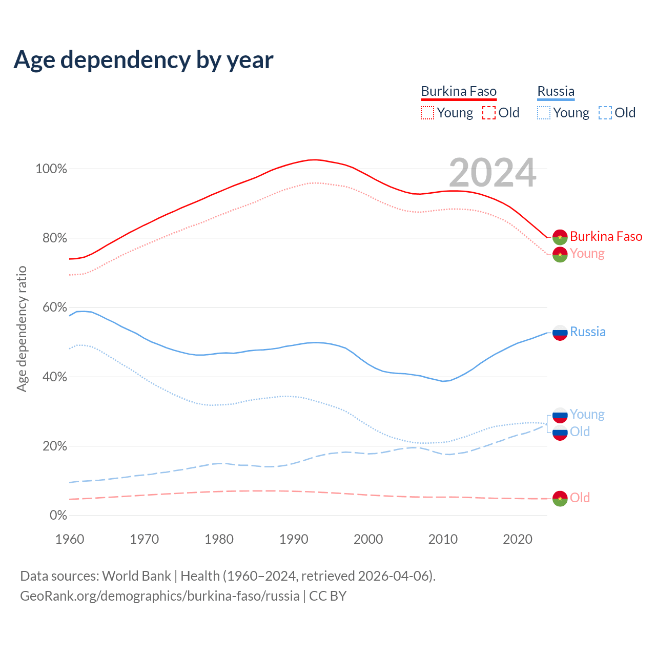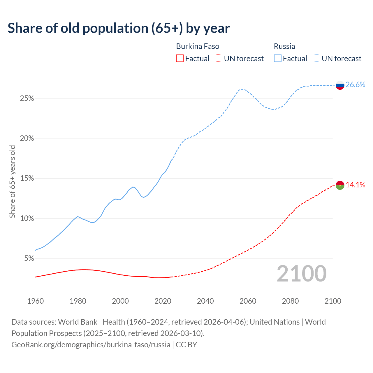 The share of older people aged 65 and over is 2.65% in Burkina Faso and 17.2% in Russia. Life expectancy in Burkina Faso compared to Russia .