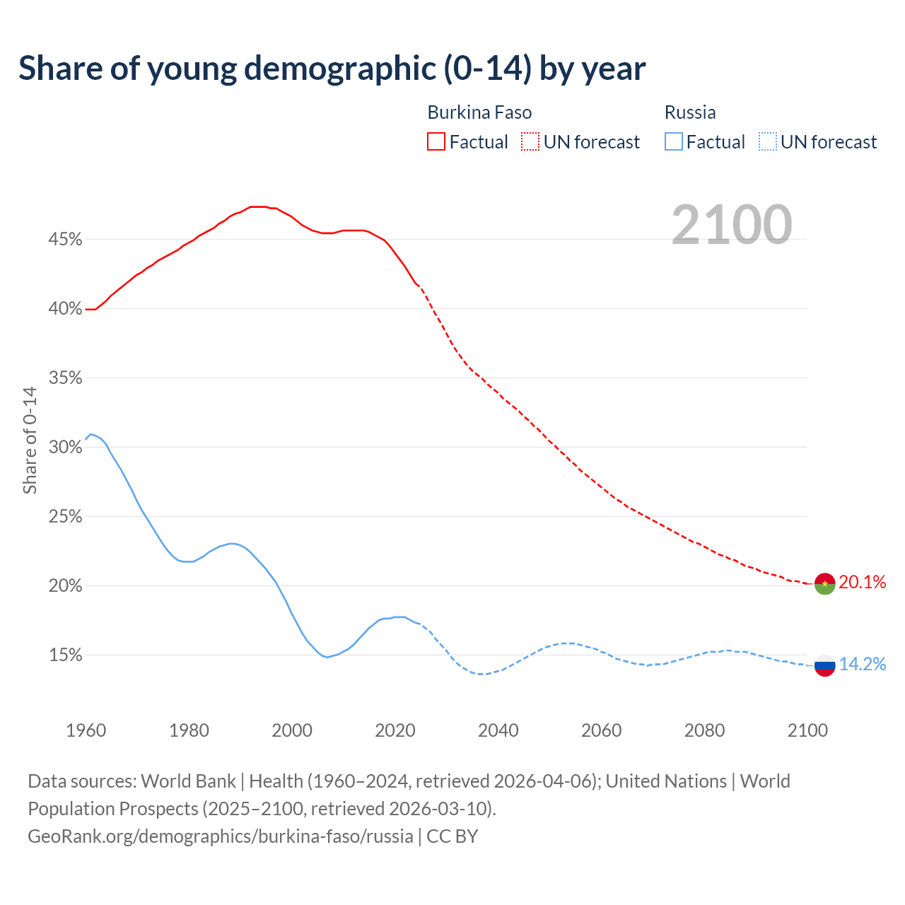 - The share of young demographic (0-15 years old) in Burkina Faso is 41.8% vs 17.3% in Russia.