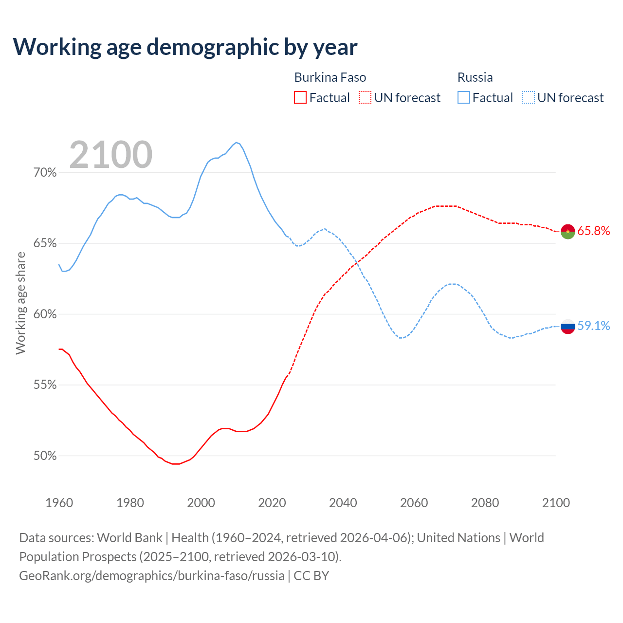 - Burkina Faso has 13.8M working age adults (aged 15-64) vs 93M in Russia.