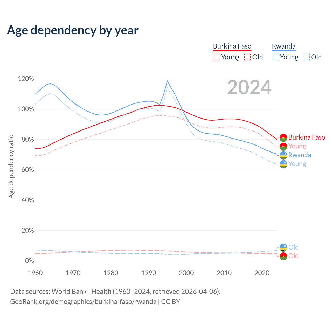 - Burkina Faso is ranked 183/196 by median age (oldest to youngest) vs 160/196 for Rwanda.