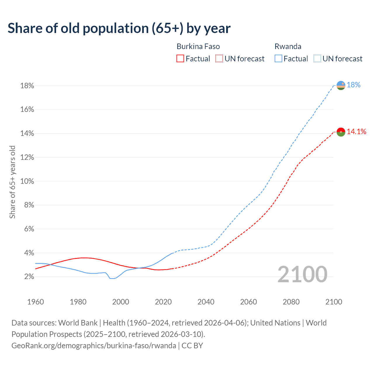 - The share of old-age demographic (65+) in Burkina Faso is 2.65% vs 3.93% in Rwanda.