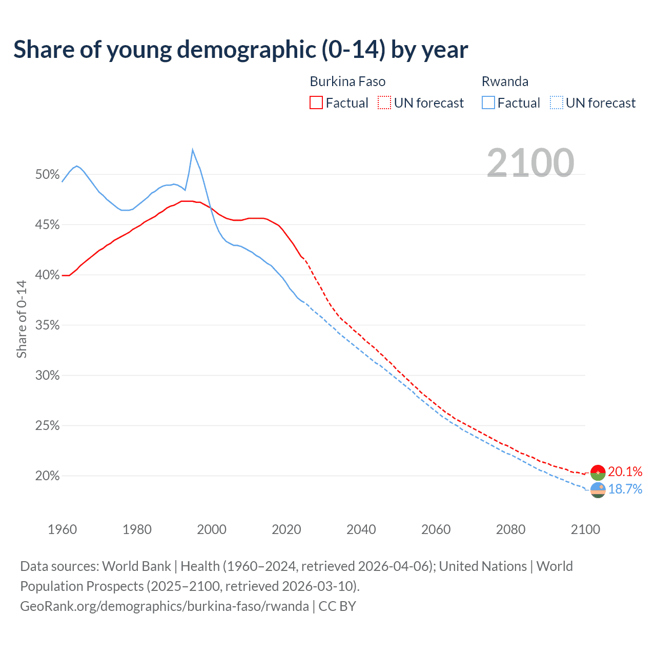 - The share of young demographic (0-15 years old) in Burkina Faso is 41.8% vs 37.4% in Rwanda.