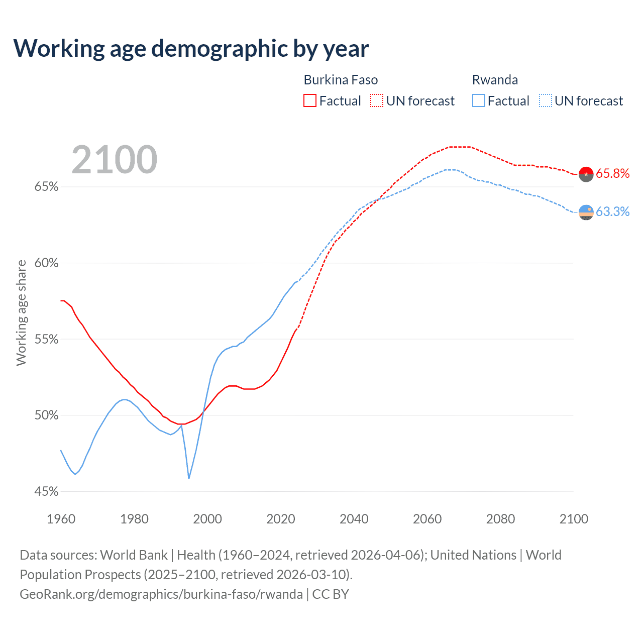 - Burkina Faso has 13.8M working age adults (aged 15-64) vs 8.79M in Rwanda.