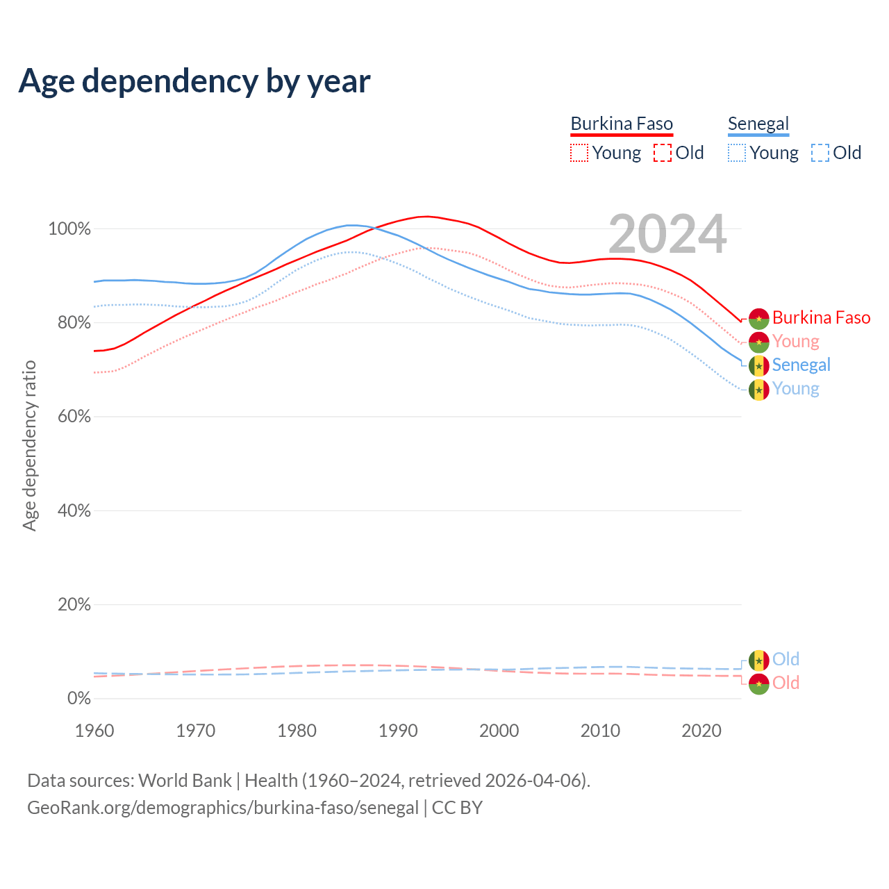 - Burkina Faso is ranked 183/196 by median age (oldest to youngest) vs 162/196 for Senegal.