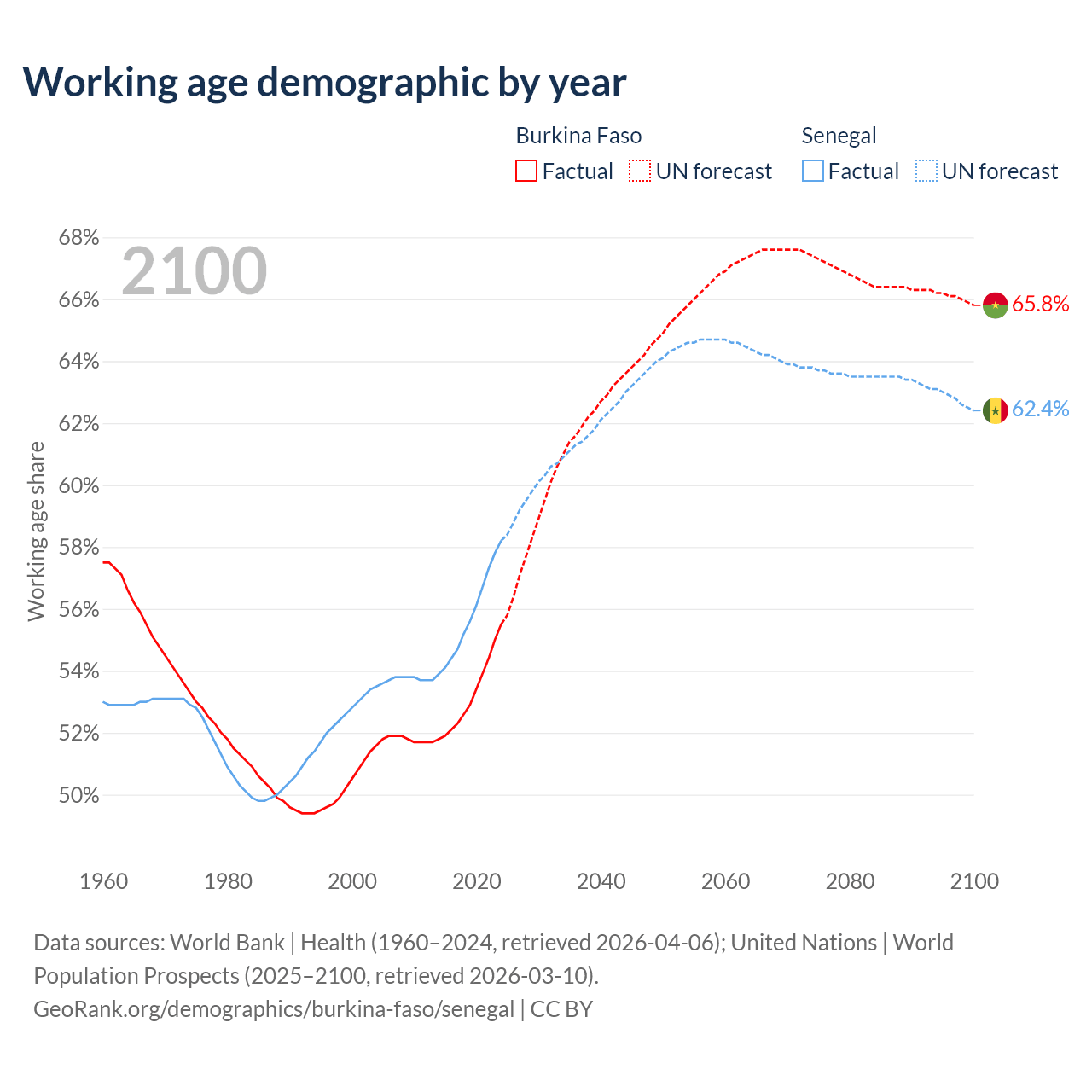 - Burkina Faso has 13.8M working age adults (aged 15-64) vs 11.3M in Senegal.