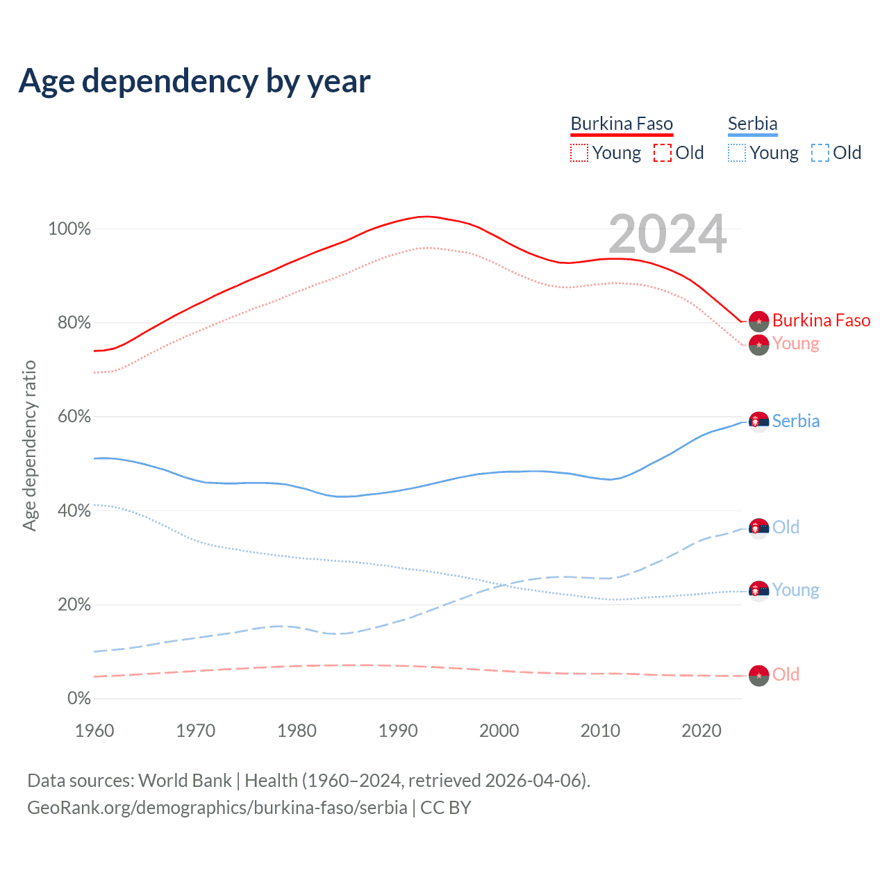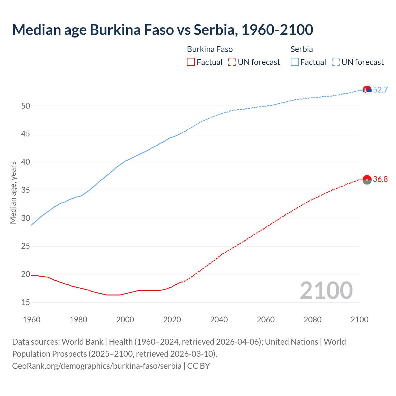 - Burkina Faso is ranked 183/196 by median age (oldest to youngest) vs 15/196 for Serbia.