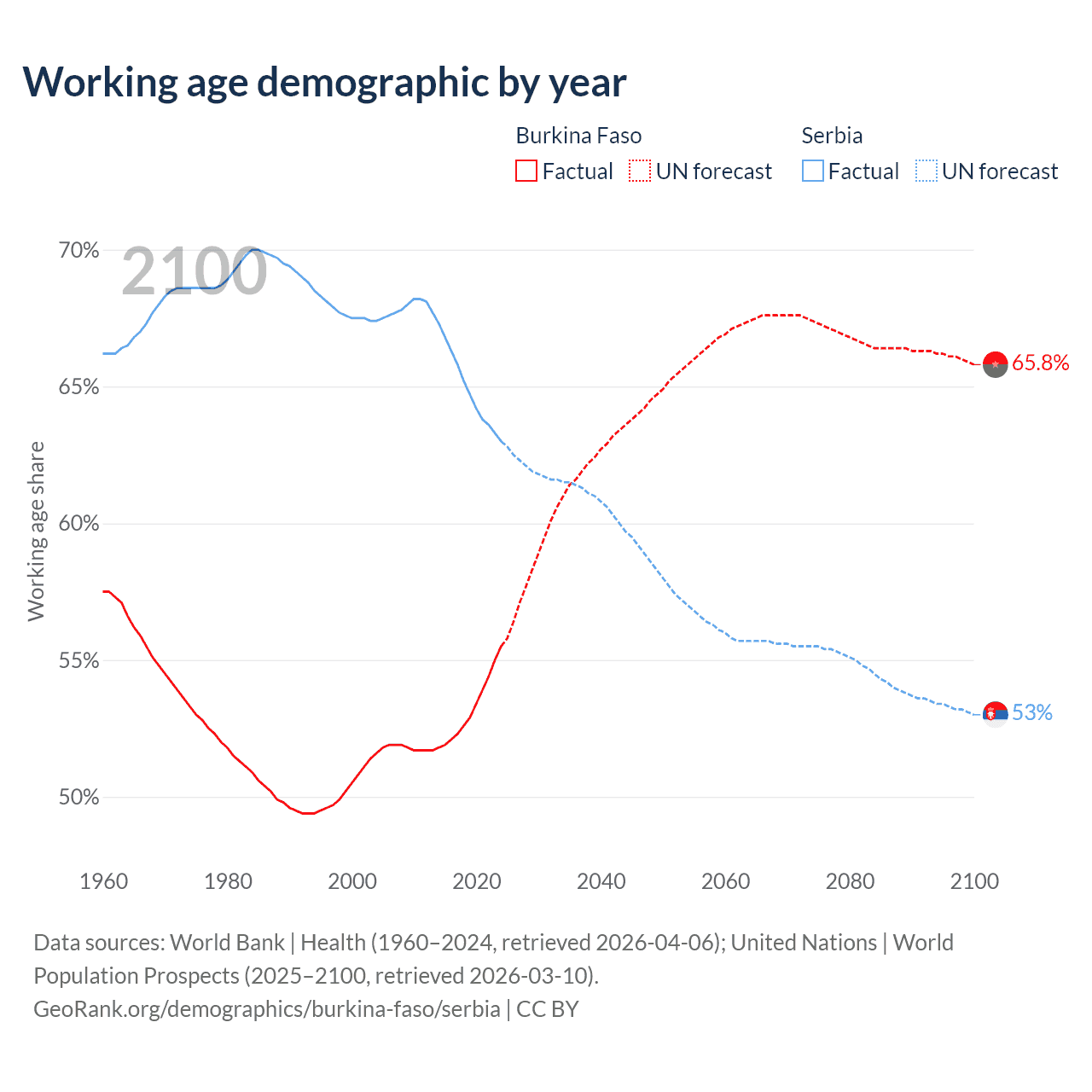 - Burkina Faso has 13.8M working age adults (aged 15-64) vs 4.09M in Serbia.