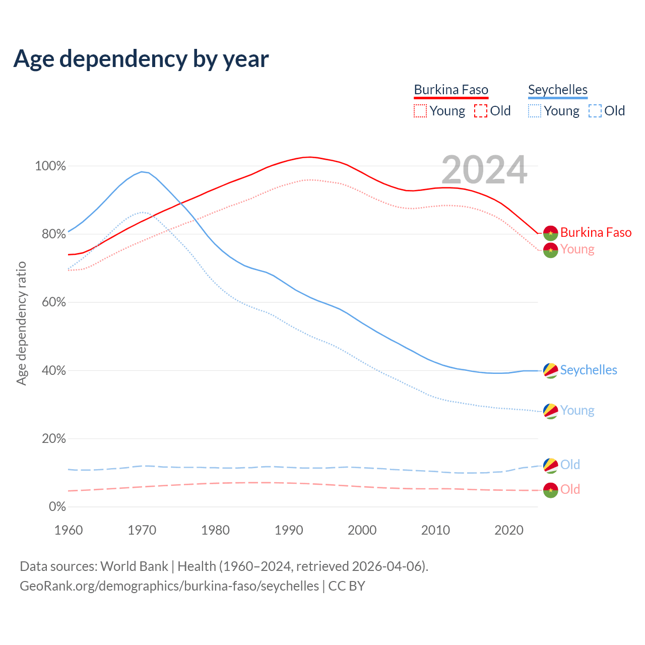- The share of old-age demographic (65+) in Burkina Faso is 2.65% vs 8.54% in the Seychelles.
