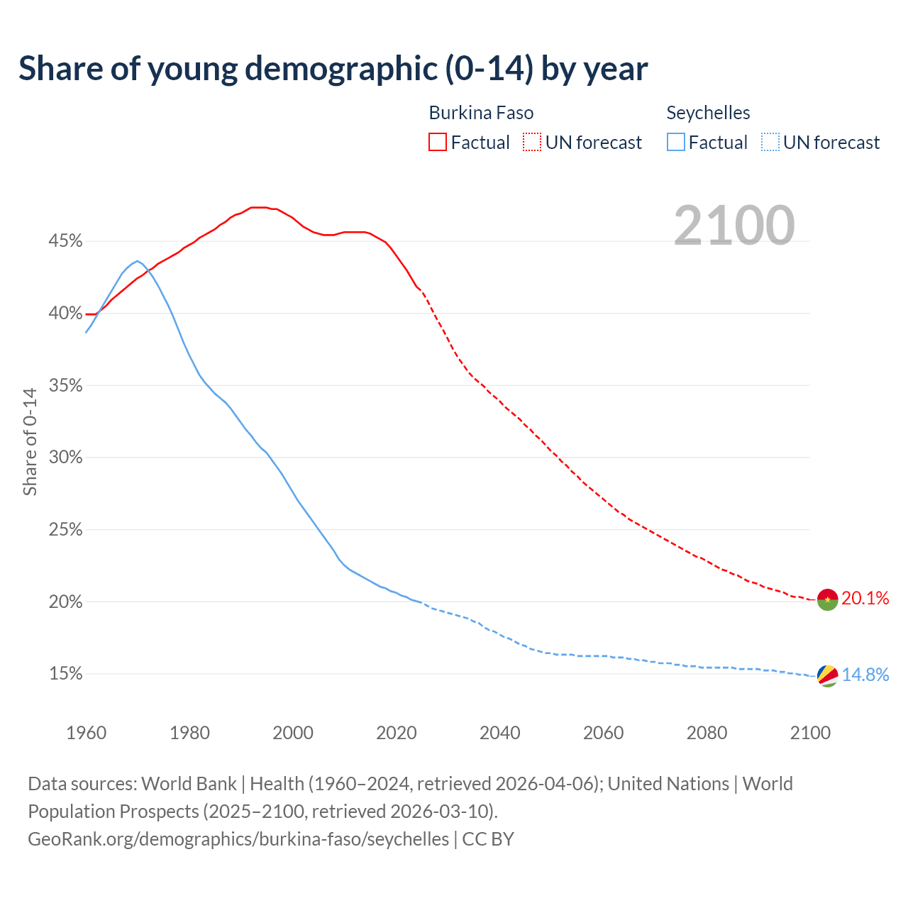- The share of young demographic (0-15 years old) in Burkina Faso is 41.8% vs 20% in the Seychelles.