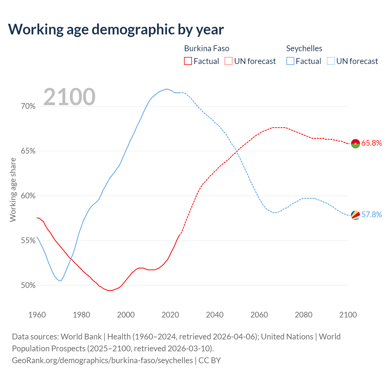 Median age Burkina Faso vs Seychelles, 1960-2100