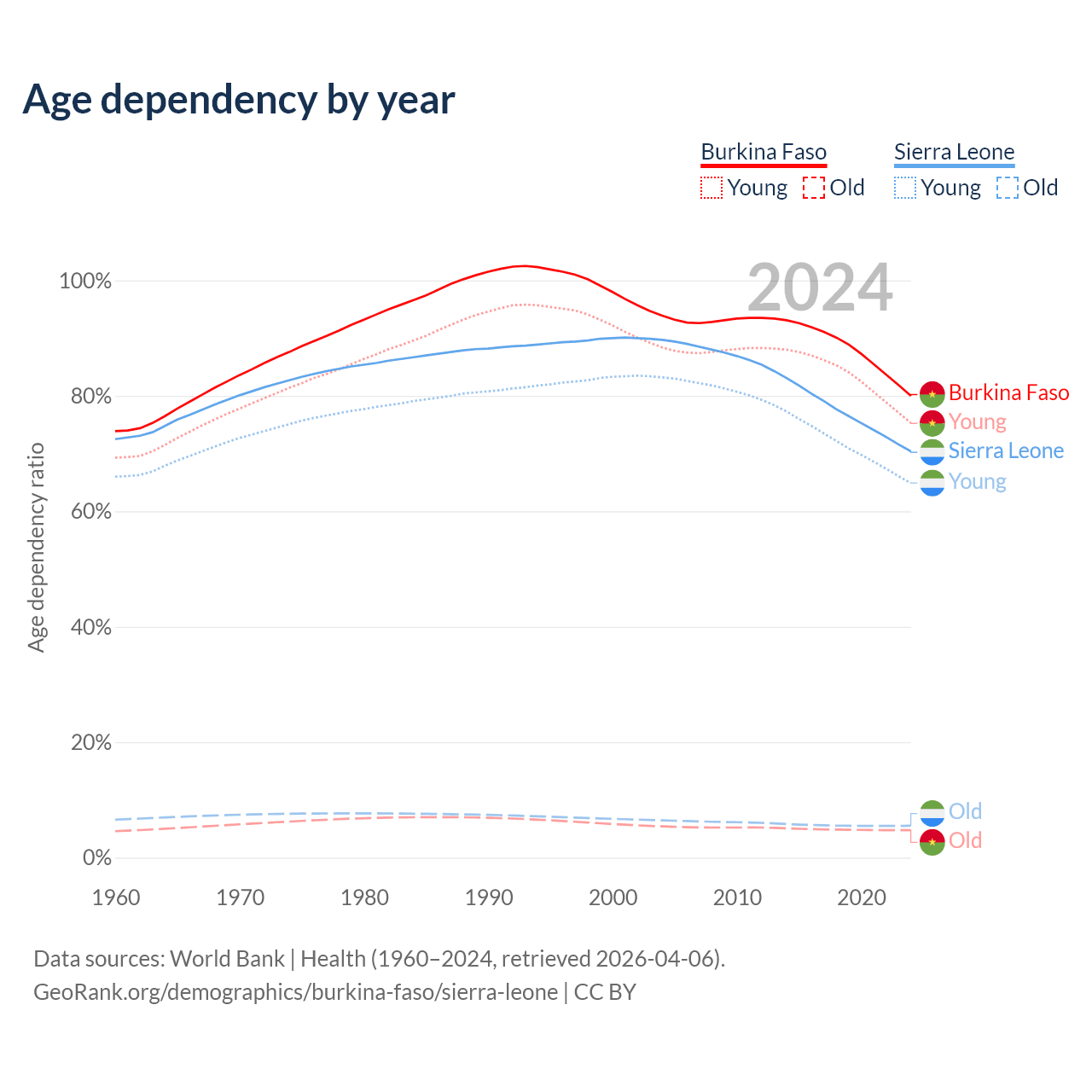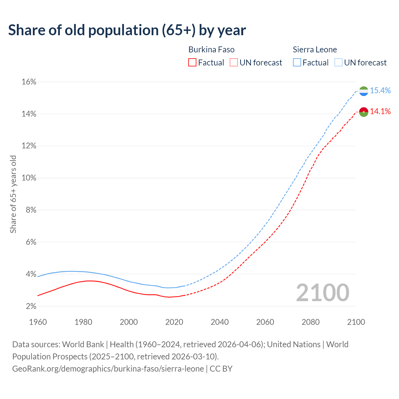 The share of older people aged 65 and over is 2.65% in Burkina Faso and 3.24% in Sierra Leone. Life expectancy in Burkina Faso compared to Sierra Leone .