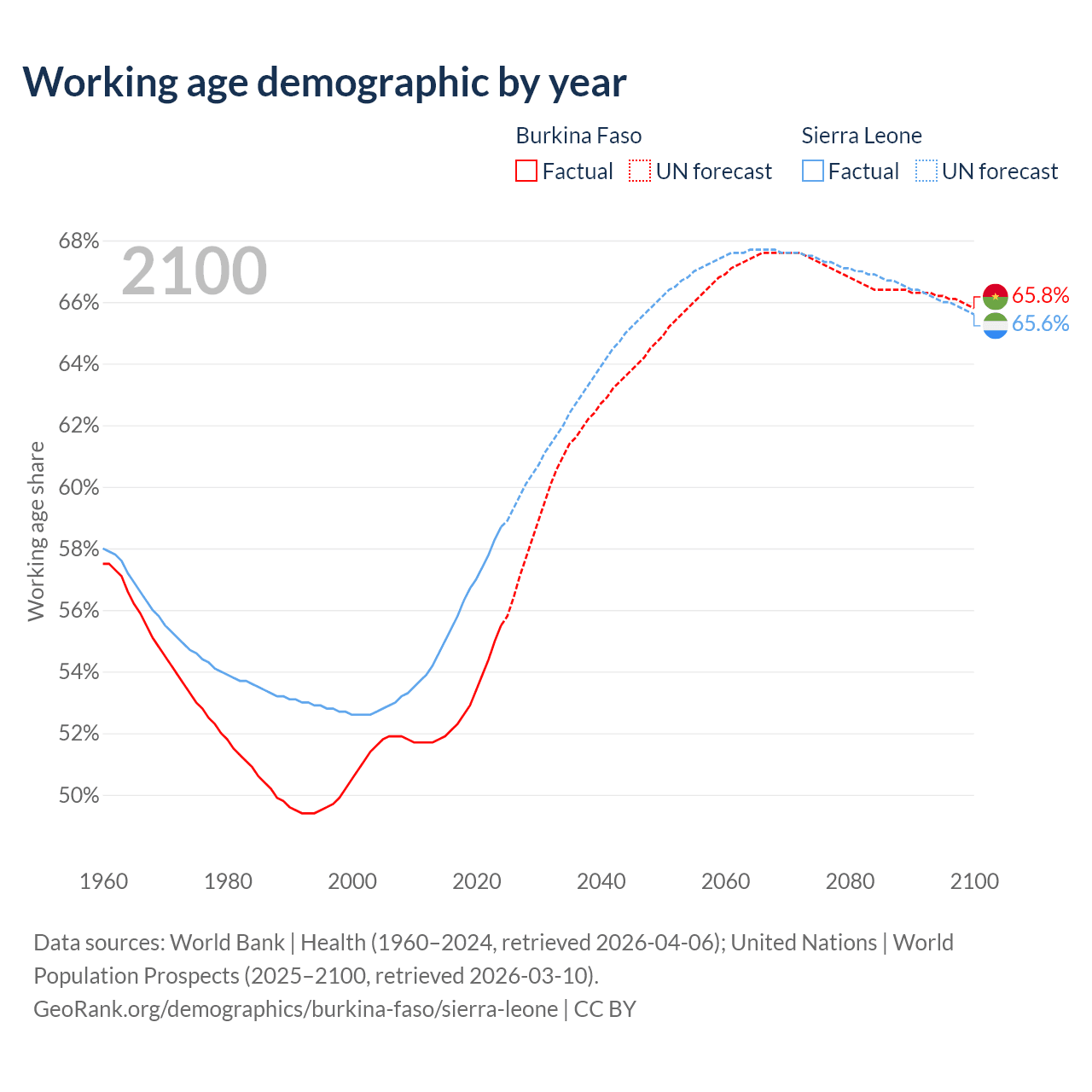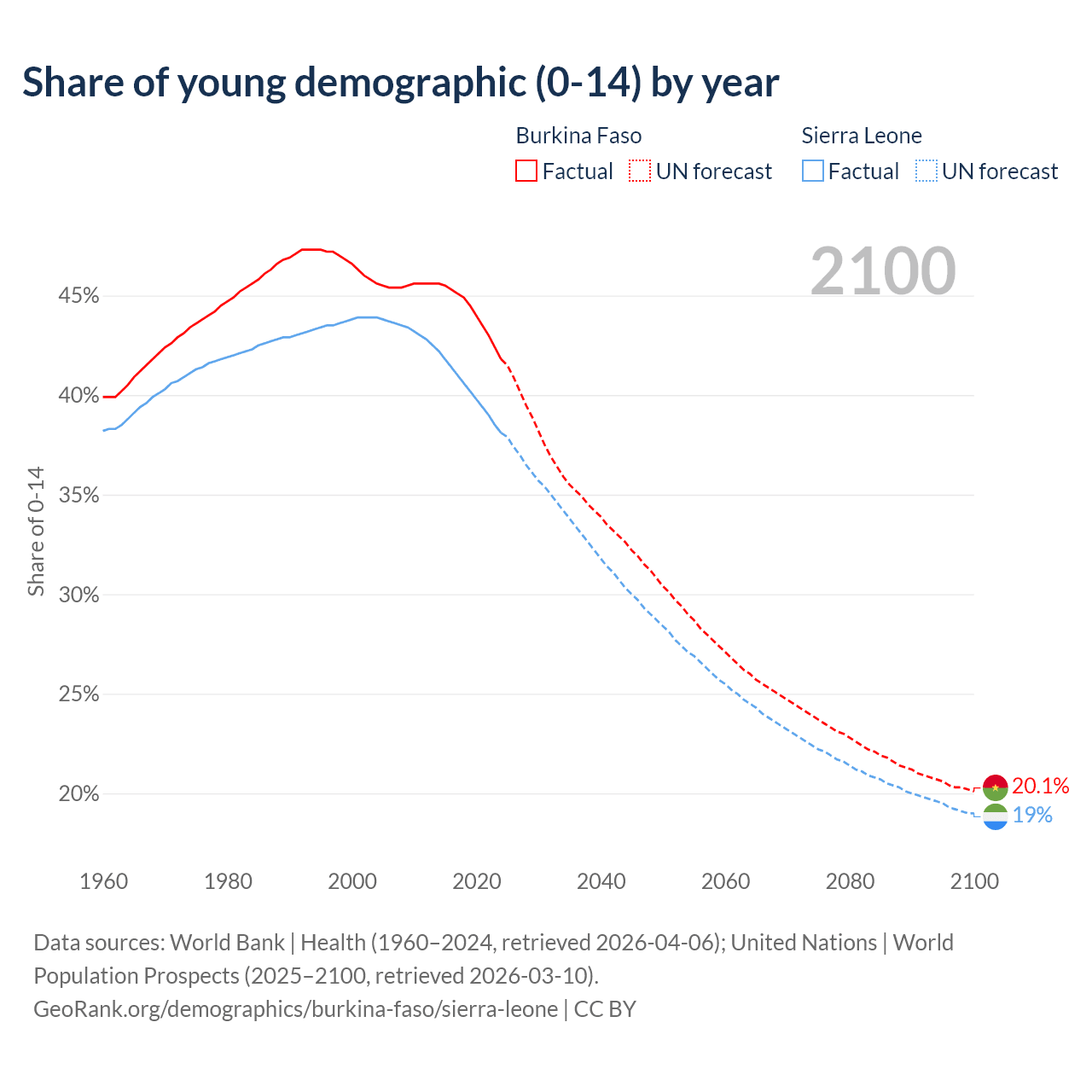 Median age Burkina Faso vs Sierra Leone, 1960-2100