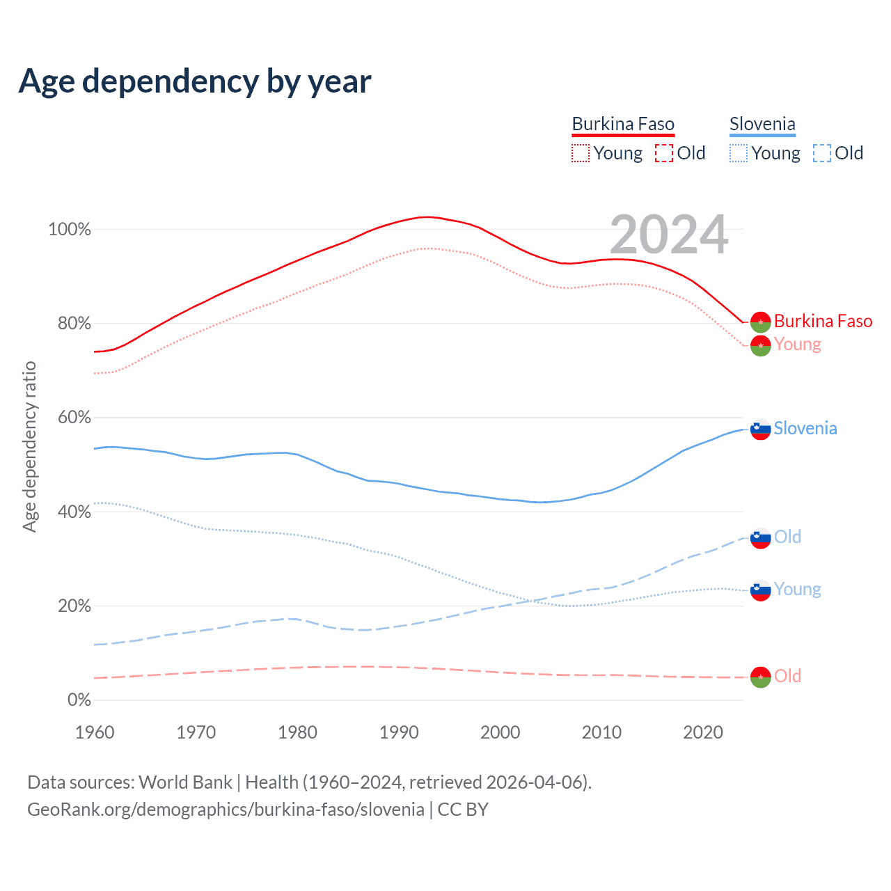 - The share of old-age demographic (65+) in Burkina Faso is 2.65% vs 21.8% in Slovenia.