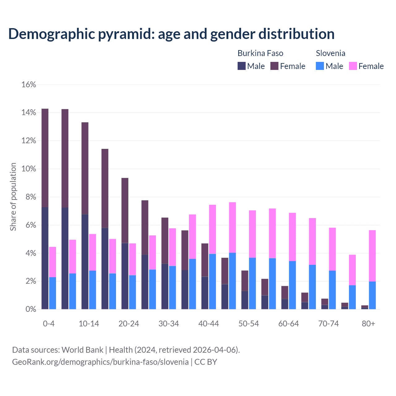 - As of 2026, the population of Burkina Faso is 24.8M vs 2.12M in Slovenia - 11.7 times difference.