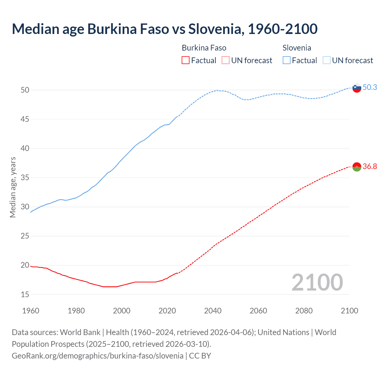 - Burkina Faso is ranked 183/196 by median age (oldest to youngest) vs 14/196 for Slovenia.