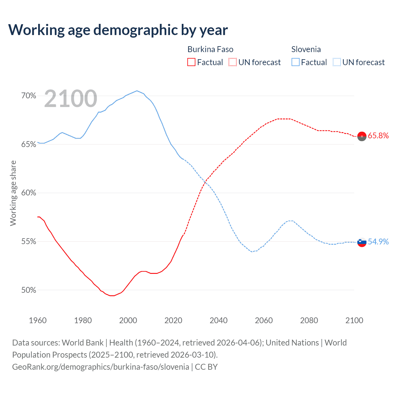 - Burkina Faso has 13.8M working age adults (aged 15-64) vs 1.35M in Slovenia.