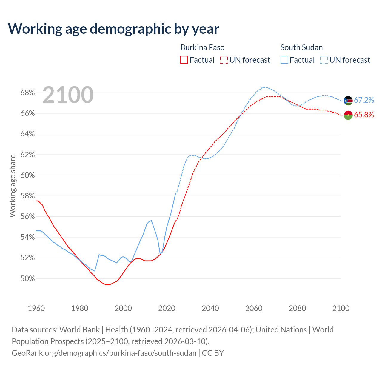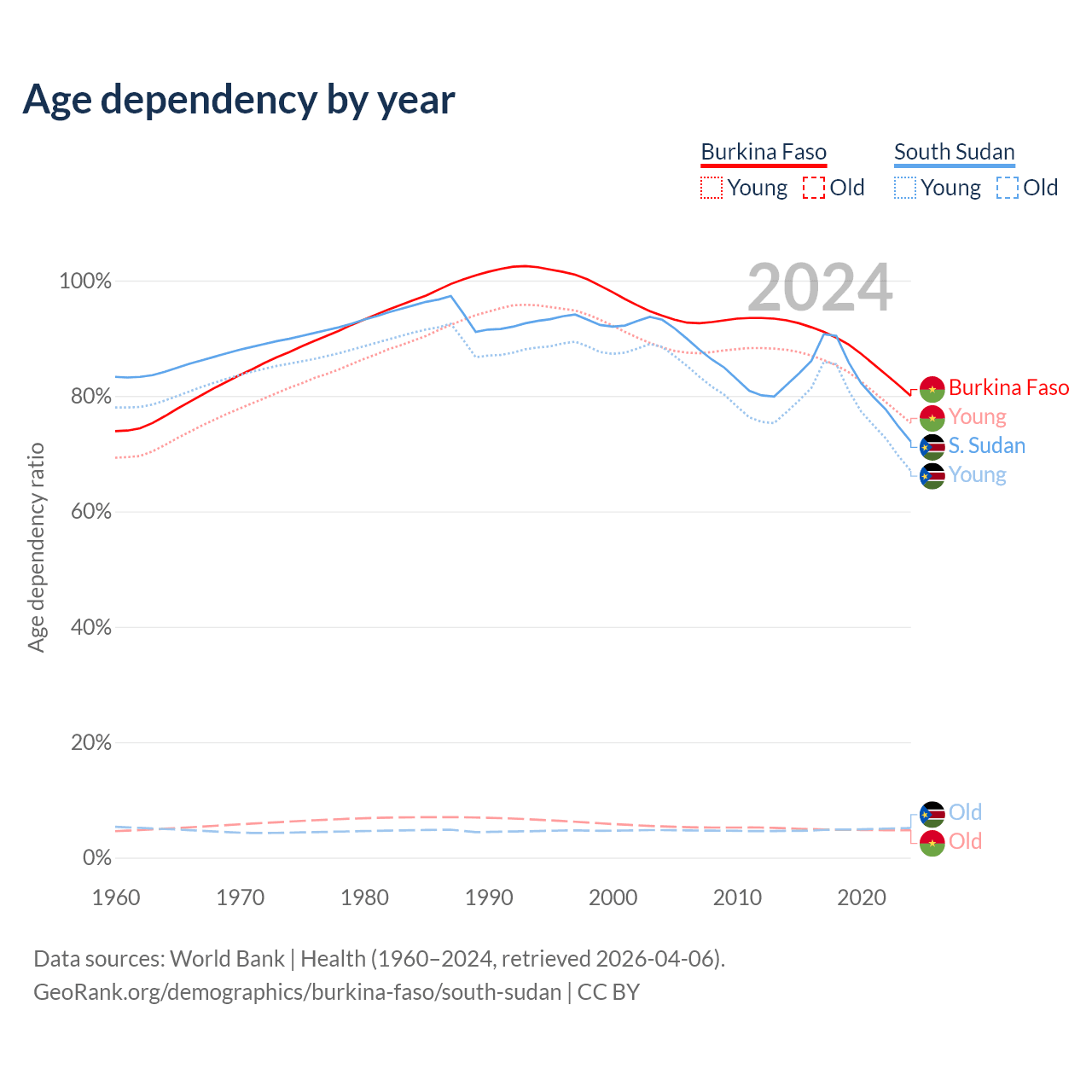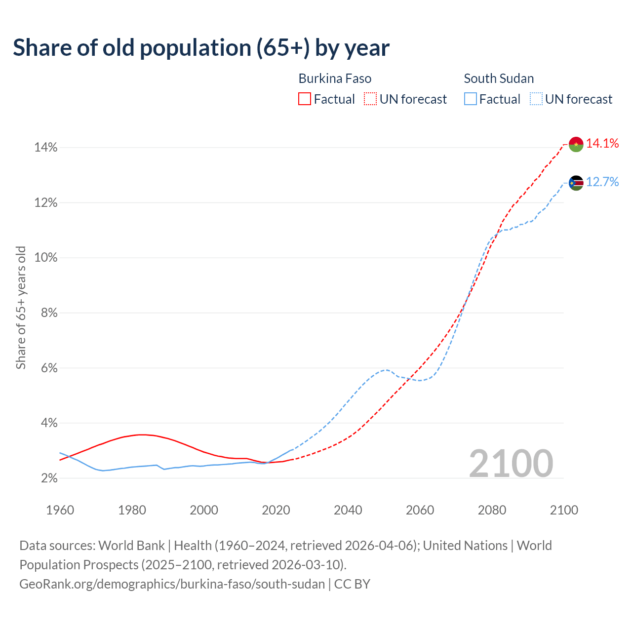 - The share of old-age demographic (65+) in Burkina Faso is 2.65% vs 2.99% in South Sudan.