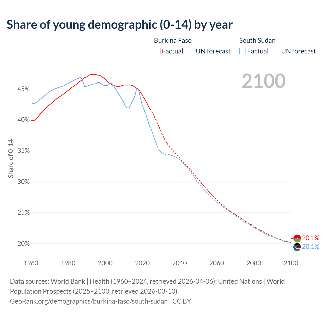 Median age Burkina Faso vs South Sudan, 1960-2100