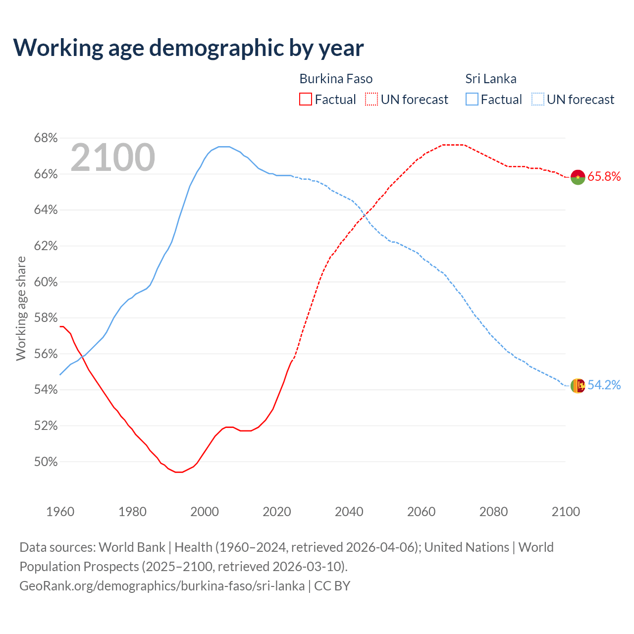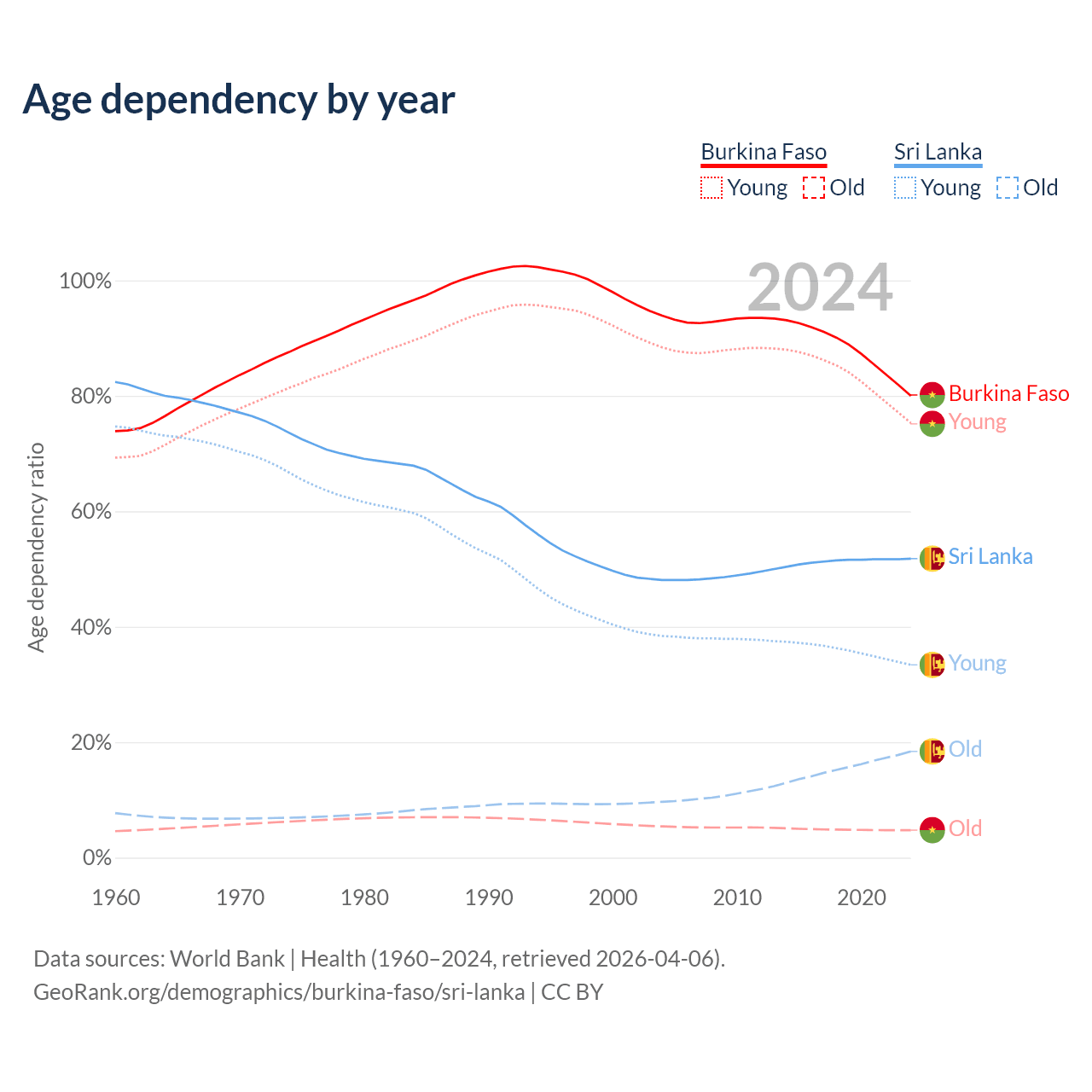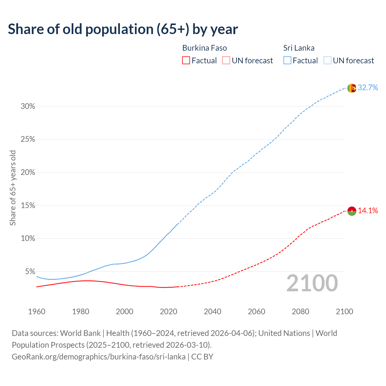 The share of older people aged 65 and over is 2.65% in Burkina Faso and 12.1% in Sri Lanka. Life expectancy in Burkina Faso compared to Sri Lanka .
