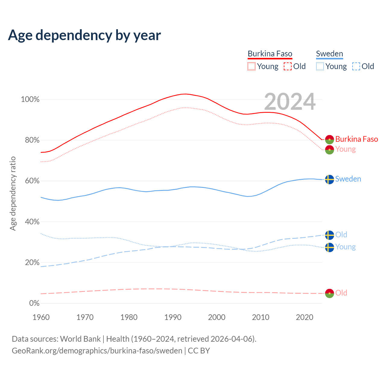 - Burkina Faso is ranked 183/196 by median age (oldest to youngest) vs 39/196 for Sweden.