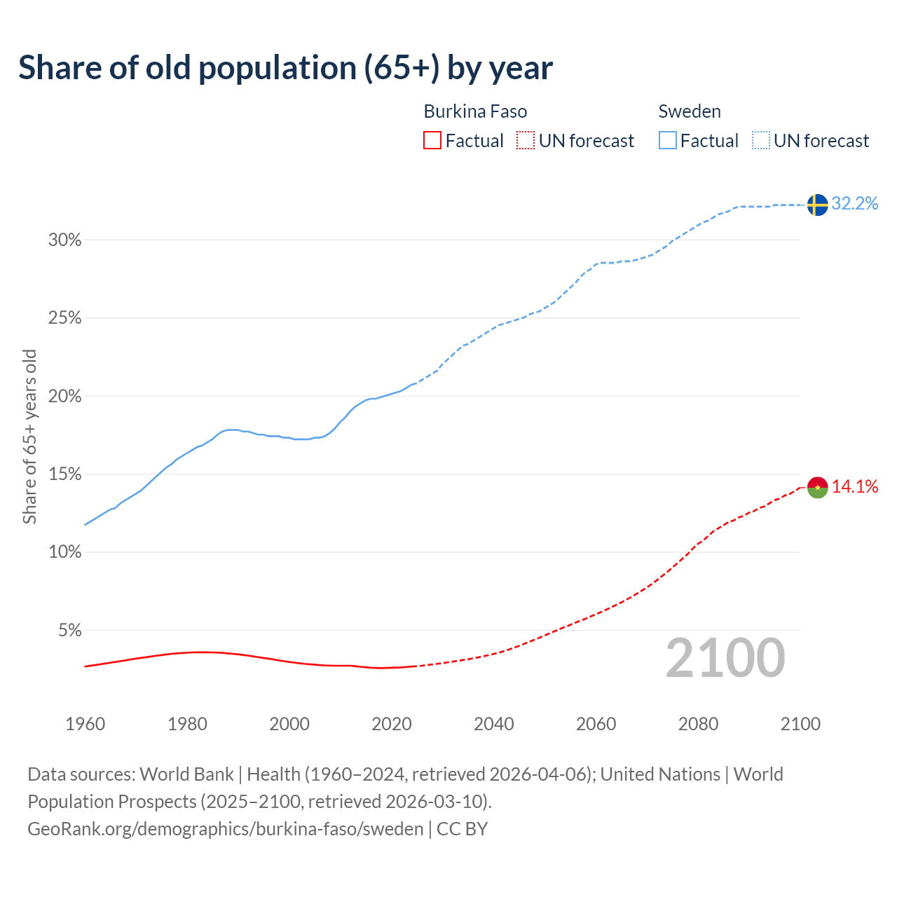 The share of older people aged 65 and over is 2.65% in Burkina Faso and 20.7% in Sweden. Life expectancy in Burkina Faso compared to Sweden .