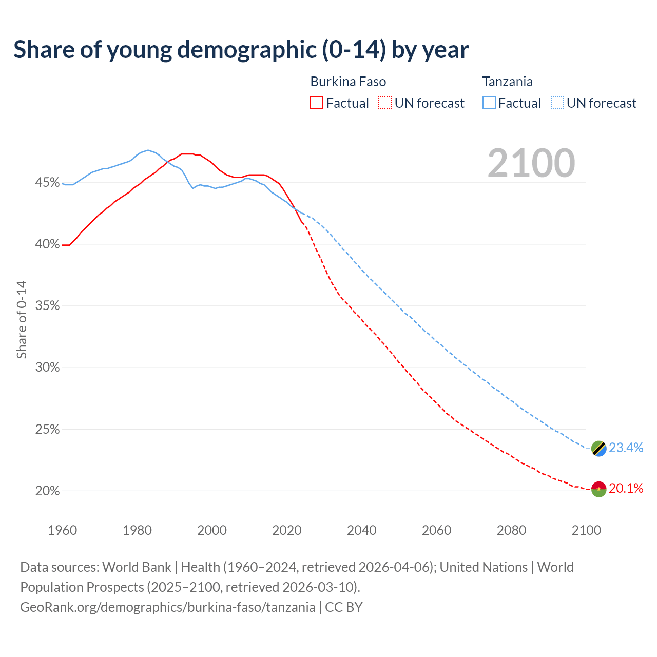 - The share of young demographic (0-15 years old) in Burkina Faso is 41.8% vs 42.5% in Tanzania.