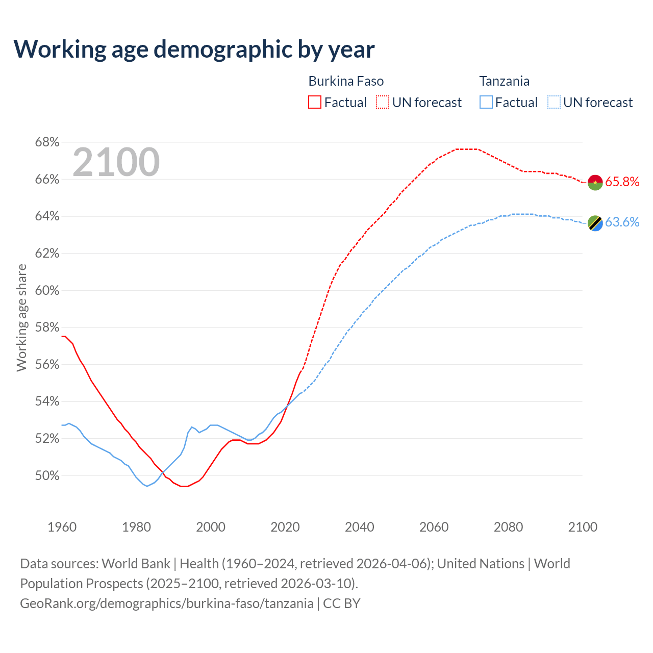 - Burkina Faso has 13.8M working age adults (aged 15-64) vs 39.8M in Tanzania.