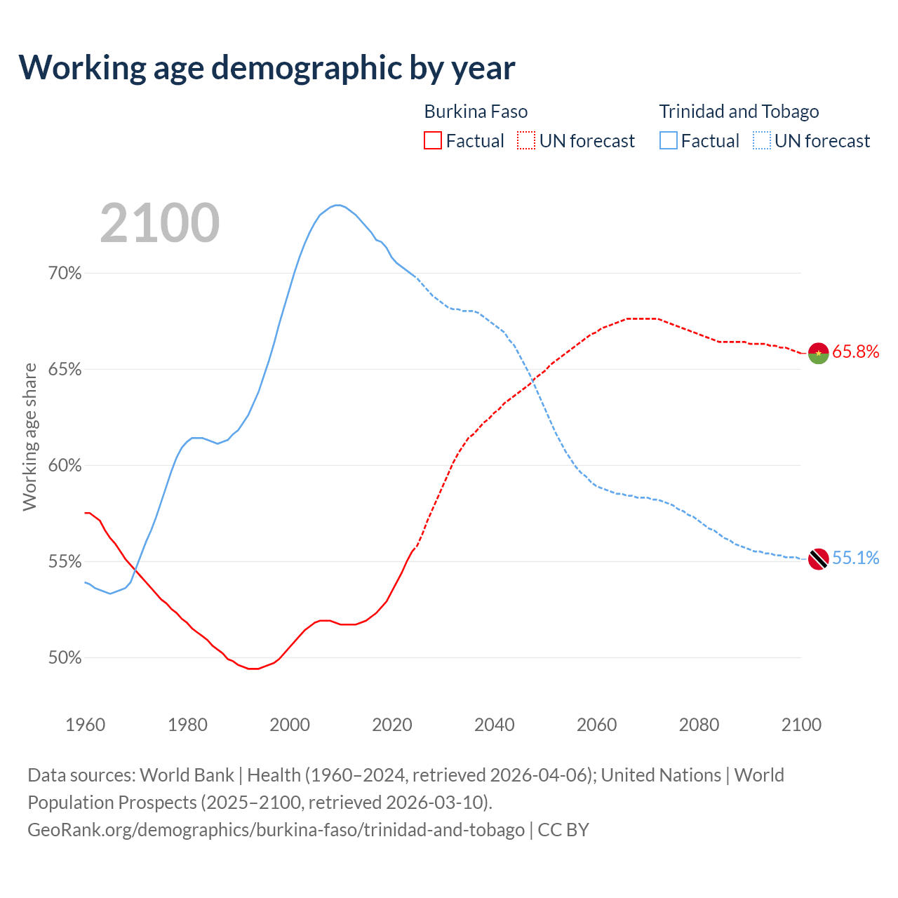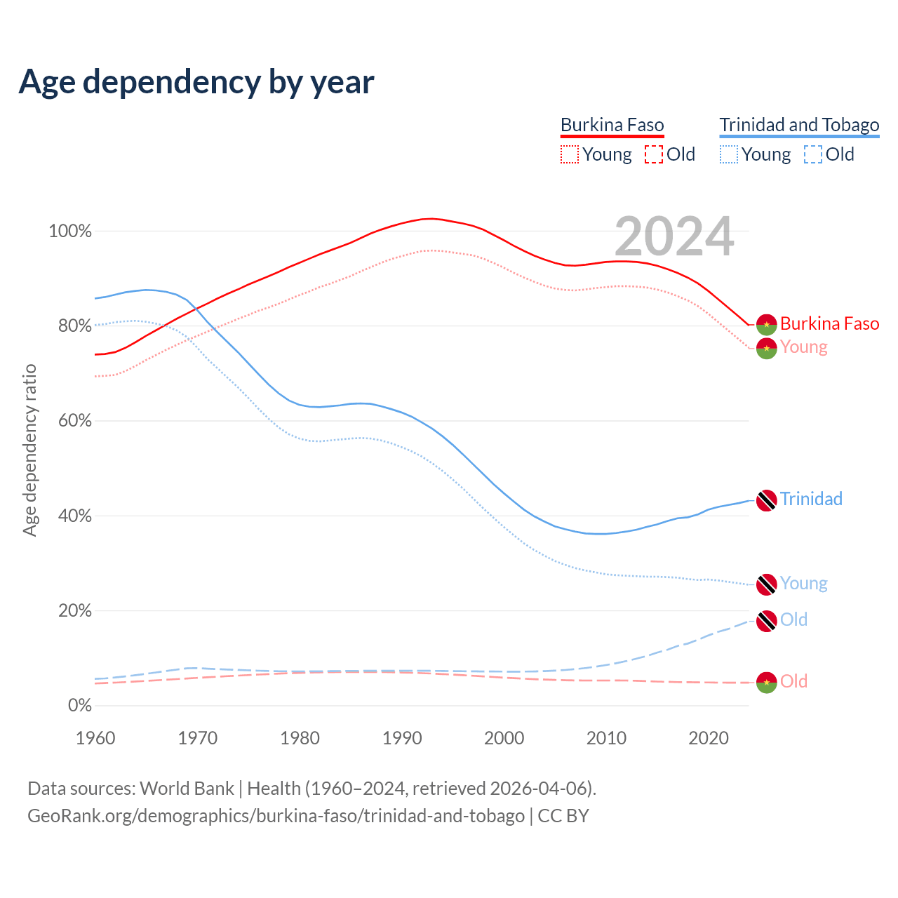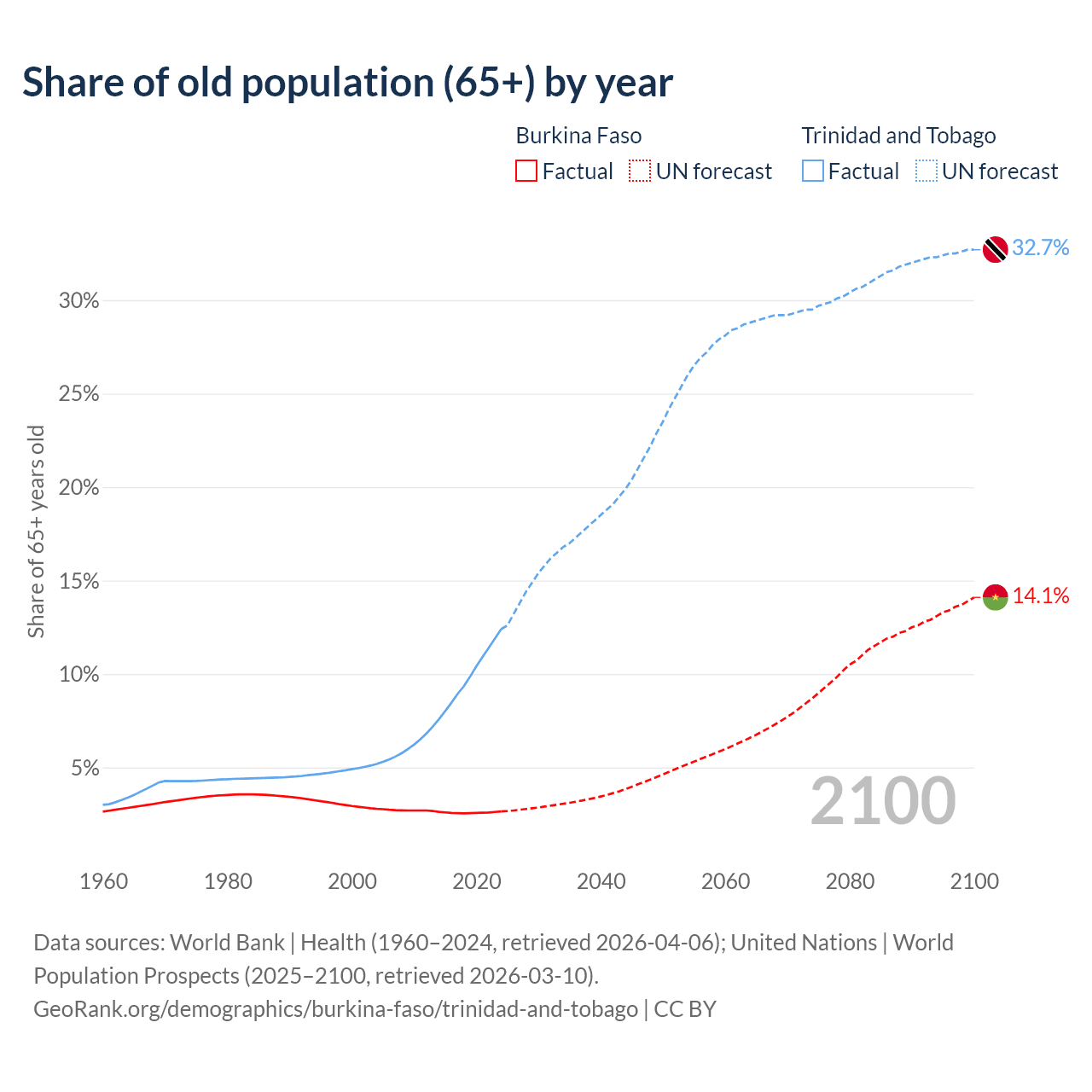 The share of older people aged 65 and over is 2.65% in Burkina Faso and 12.4% in Trinidad and Tobago. Life expectancy in Burkina Faso compared to Trinidad and Tobago .
