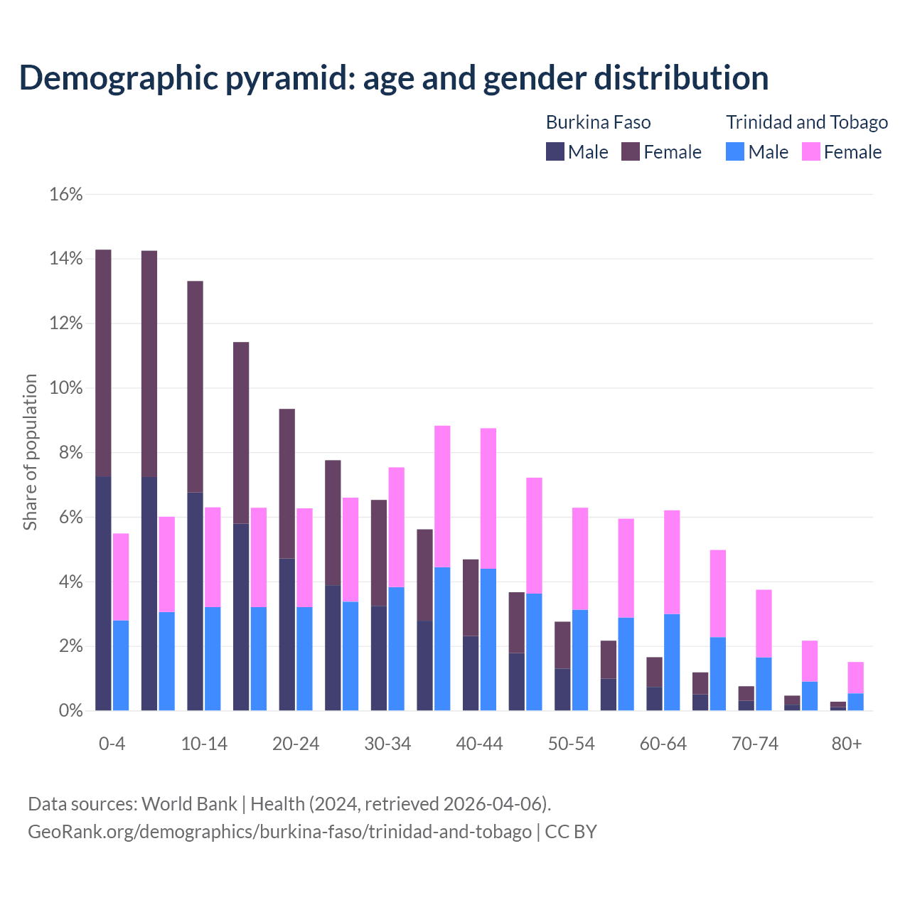 - As of 2026, the population of Burkina Faso is 24.8M vs 1.37M in Trinidad and Tobago - 18 times difference.