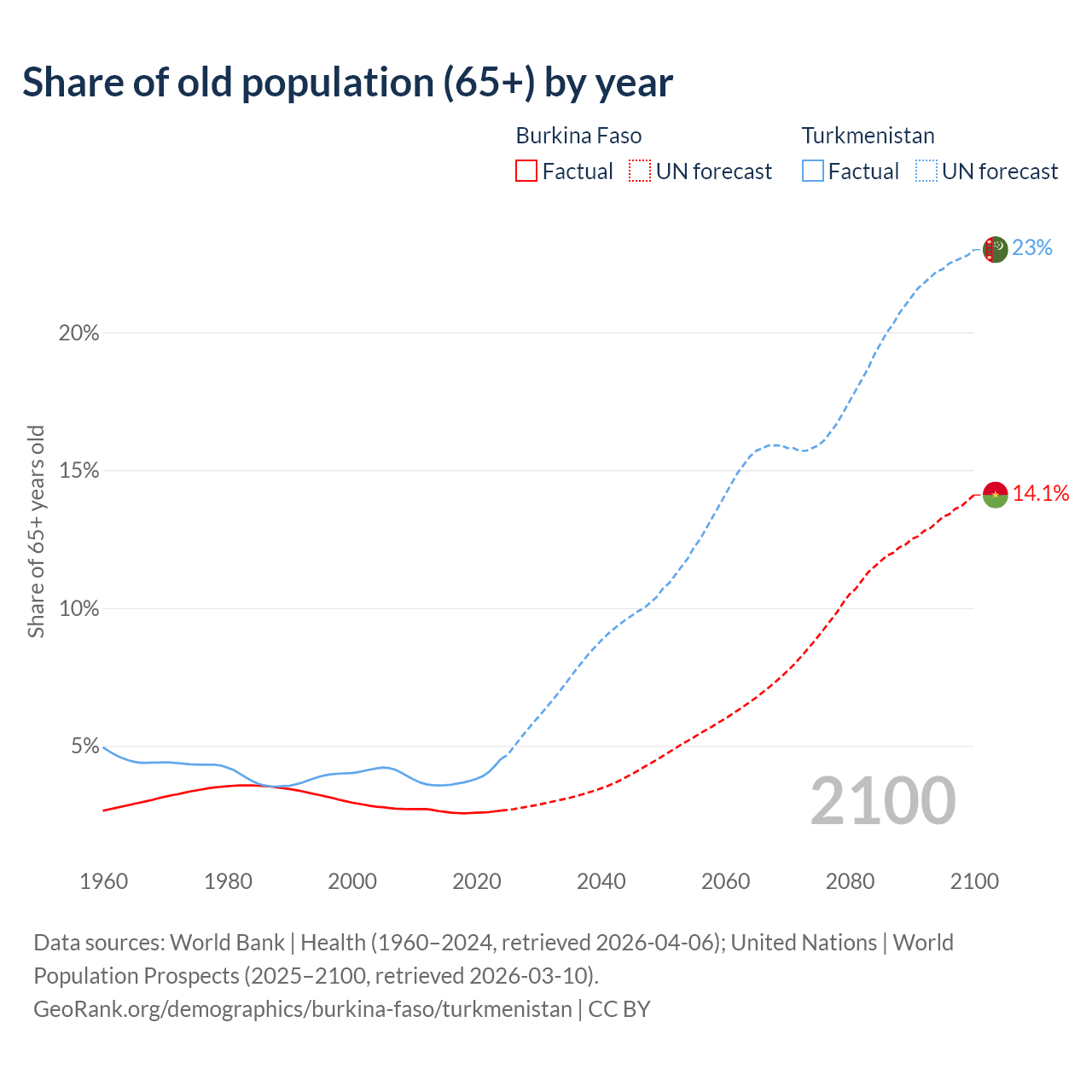 The share of older people aged 65 and over is 2.65% in Burkina Faso and 4.53% in Turkmenistan. Life expectancy in Burkina Faso compared to Turkmenistan .