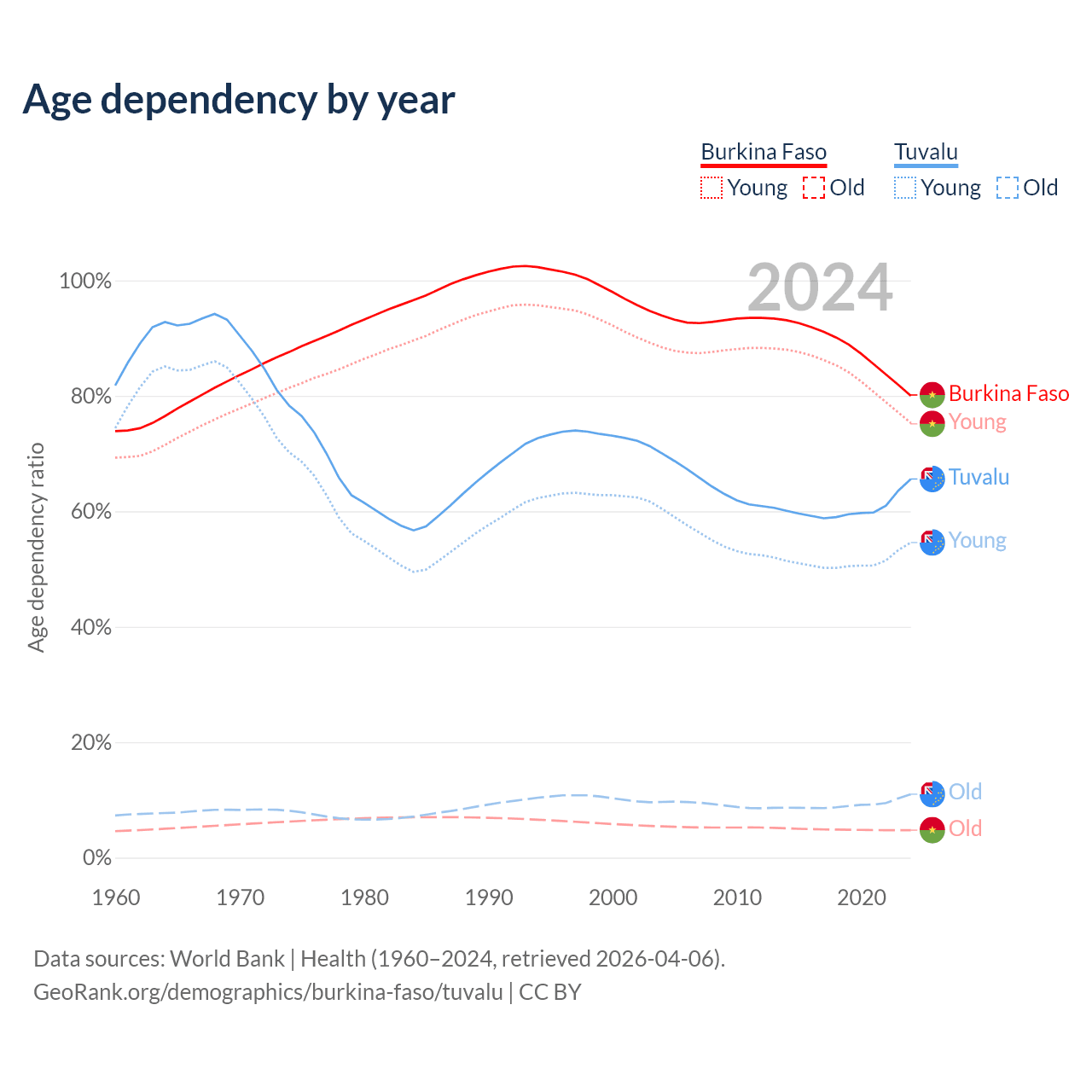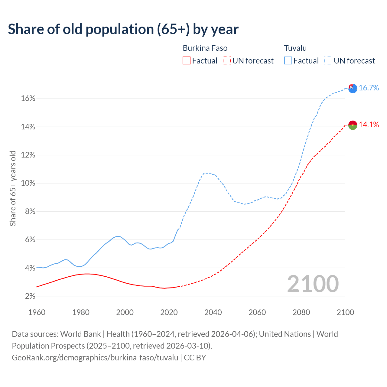 - The share of old-age demographic (65+) in Burkina Faso is 2.65% vs 6.67% in Tuvalu.