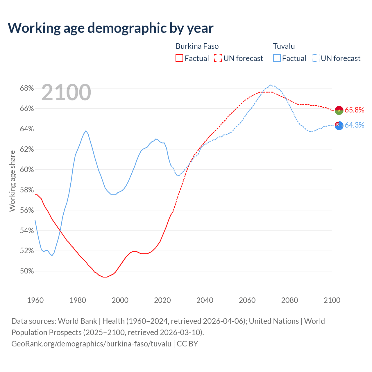 - Burkina Faso has 13.8M working age adults (aged 15-64) vs 5.64K in Tuvalu.