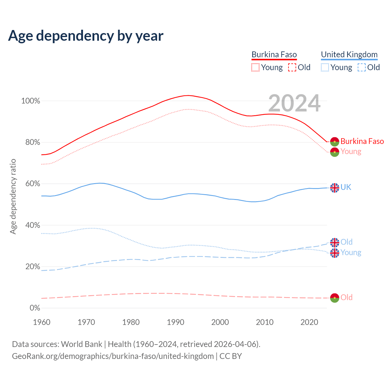 Data sources: World Bank | Health (1960–2024, retrieved 2026-04-06); U.S. Census Bureau (1960–2024, retrieved 2026-02-08).