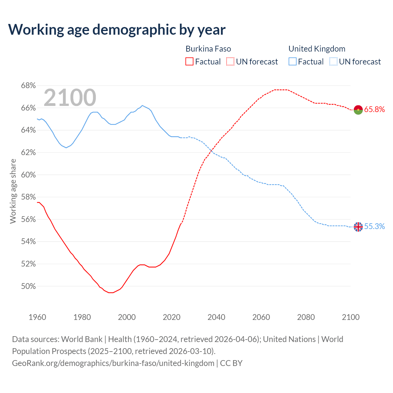 Median age Burkina Faso vs United Kingdom, 1960-2100