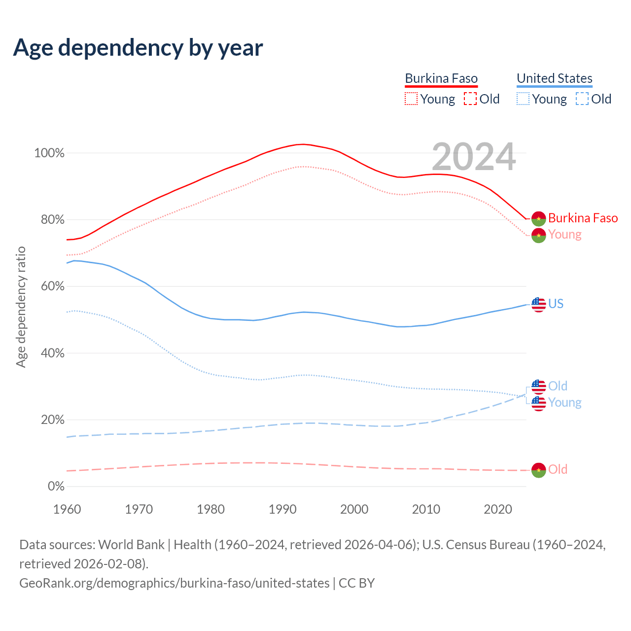 - The share of old-age demographic (65+) in Burkina Faso is 2.65% vs 17.9% in the United States.