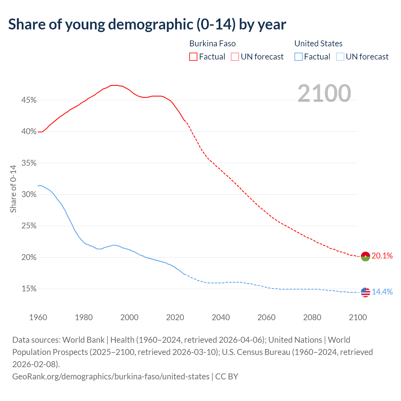 - The share of young demographic (0-15 years old) in Burkina Faso is 41.8% vs 17.3% in the United States.