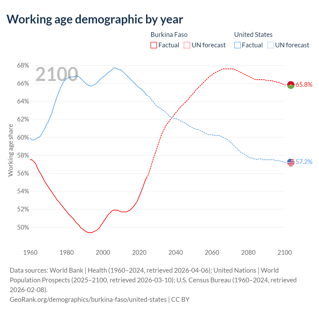 - Burkina Faso has 13.8M working age adults (aged 15-64) vs 223M in the United States.