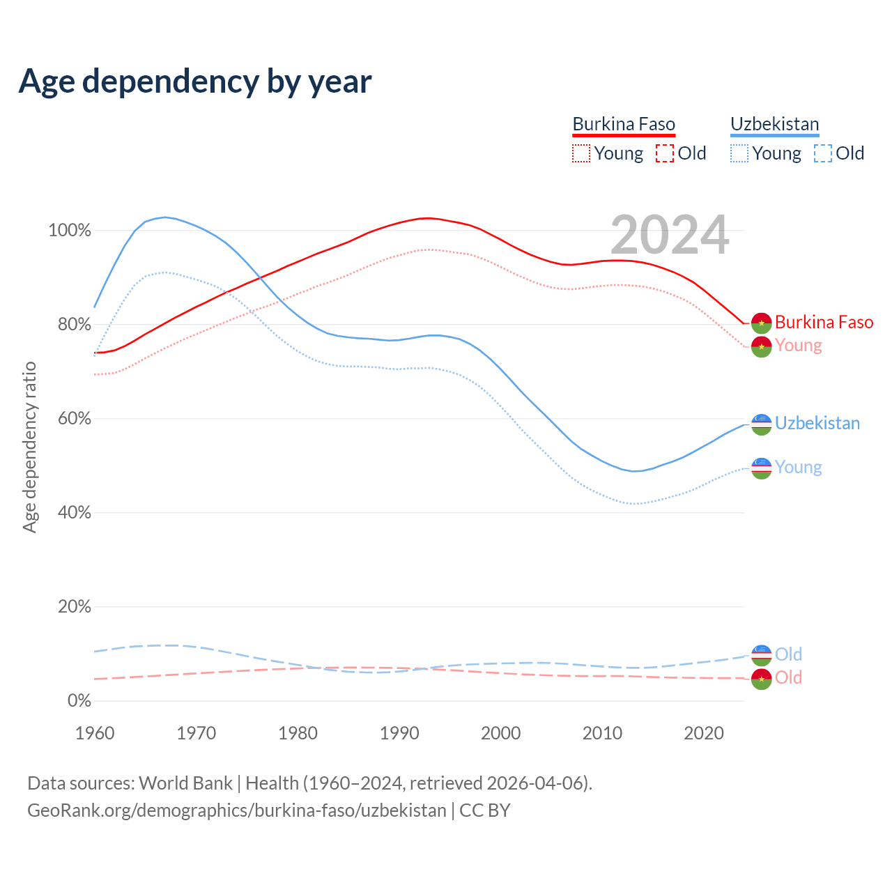 - The share of old-age demographic (65+) in Burkina Faso is 2.65% vs 5.86% in Uzbekistan.