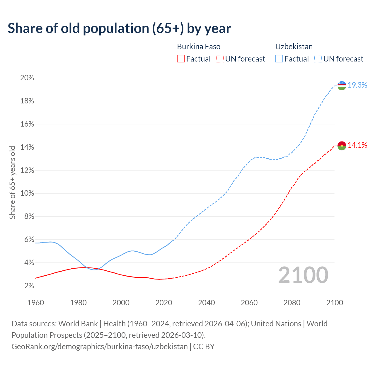 The share of older people aged 65 and over is 2.65% in Burkina Faso and 5.86% in Uzbekistan. Life expectancy in Burkina Faso compared to Uzbekistan .