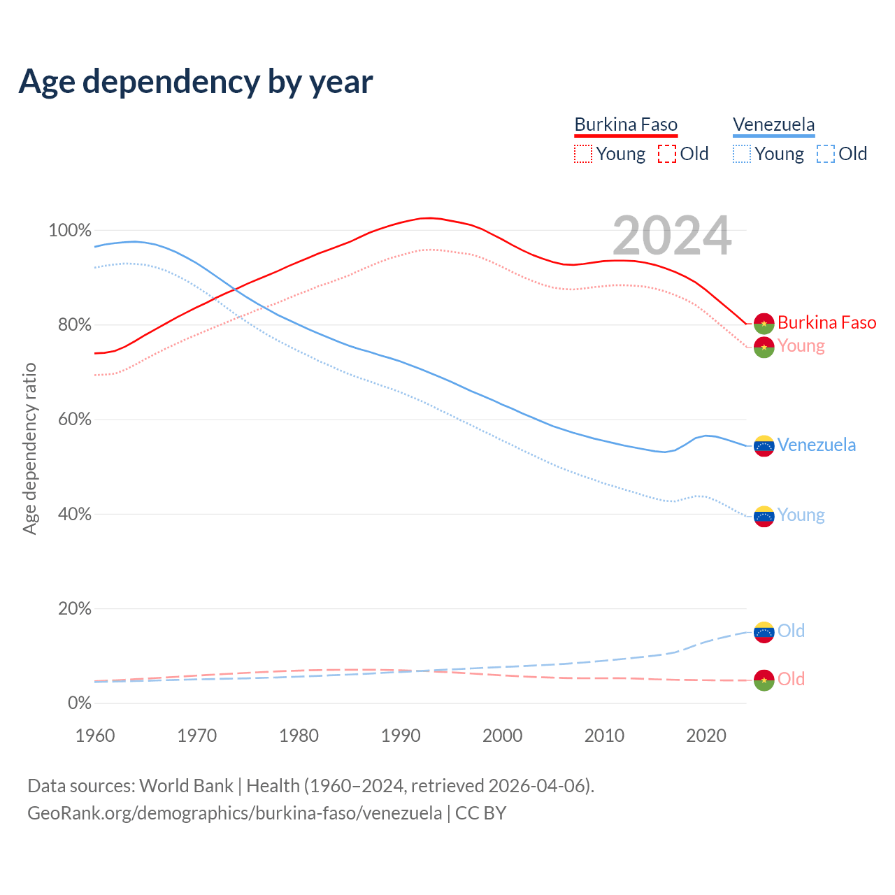 - Burkina Faso is ranked 183/196 by median age (oldest to youngest) vs 104/196 for Venezuela.