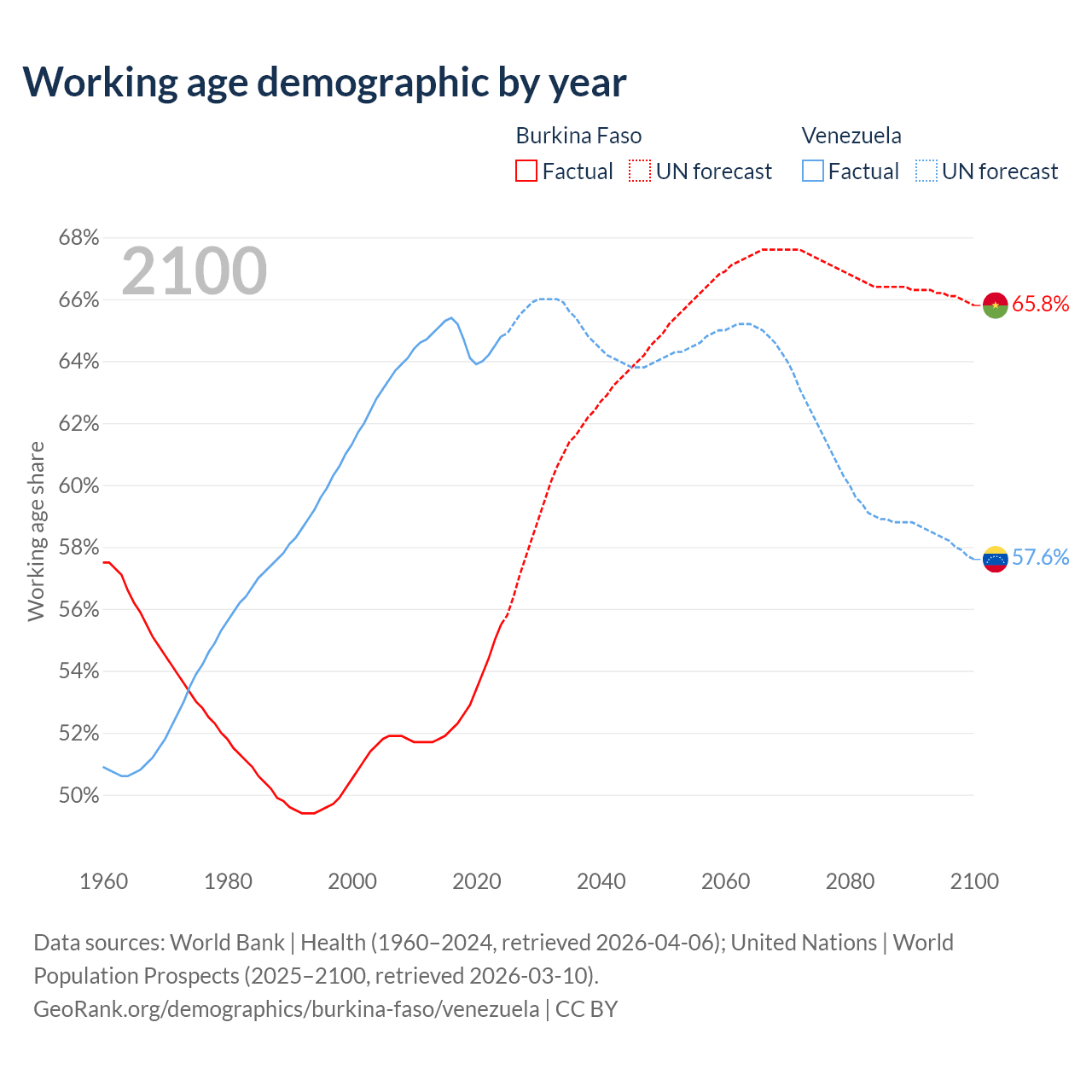- Burkina Faso has 13.8M working age adults (aged 15-64) vs 18.6M in Venezuela.