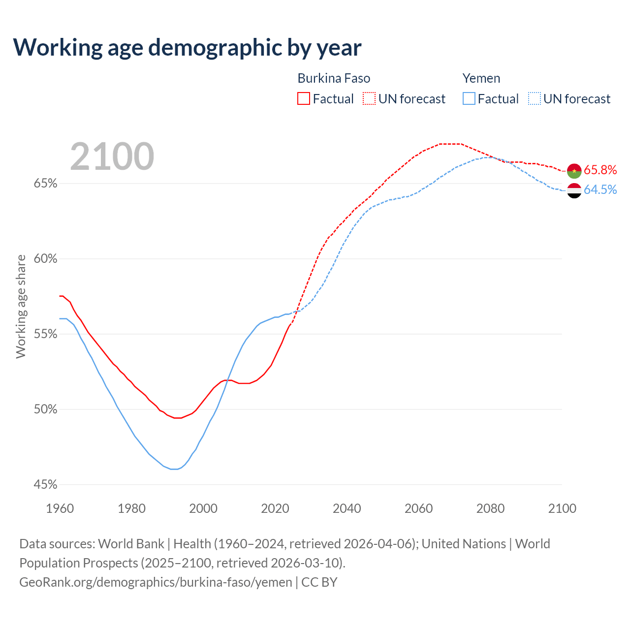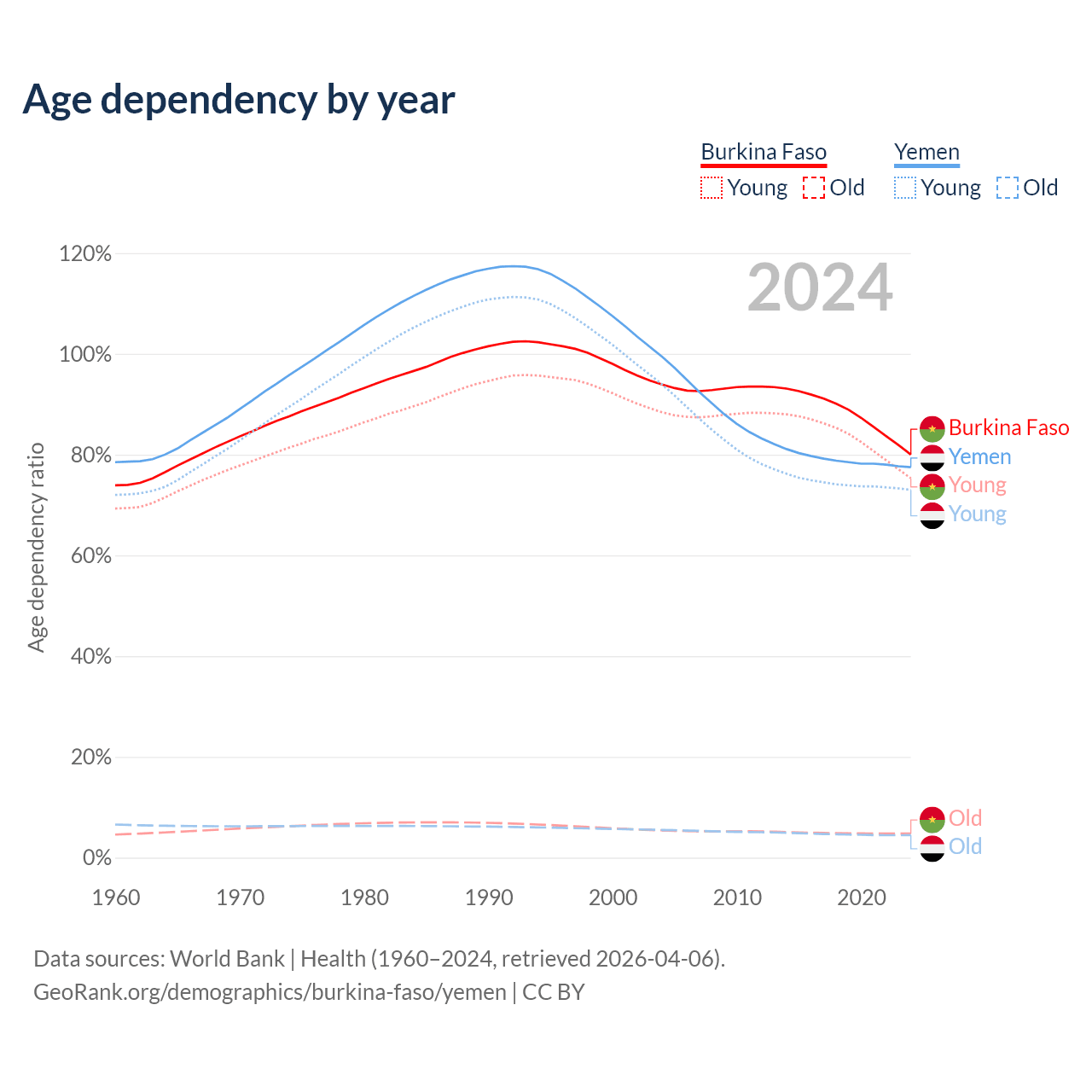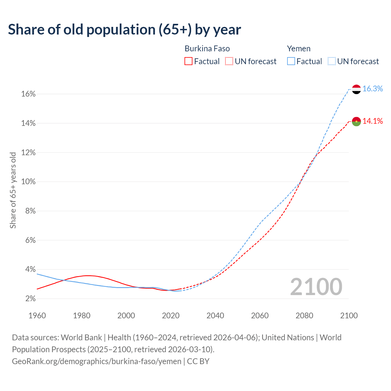 - The share of old-age demographic (65+) in Burkina Faso is 2.65% vs 2.52% in Yemen.