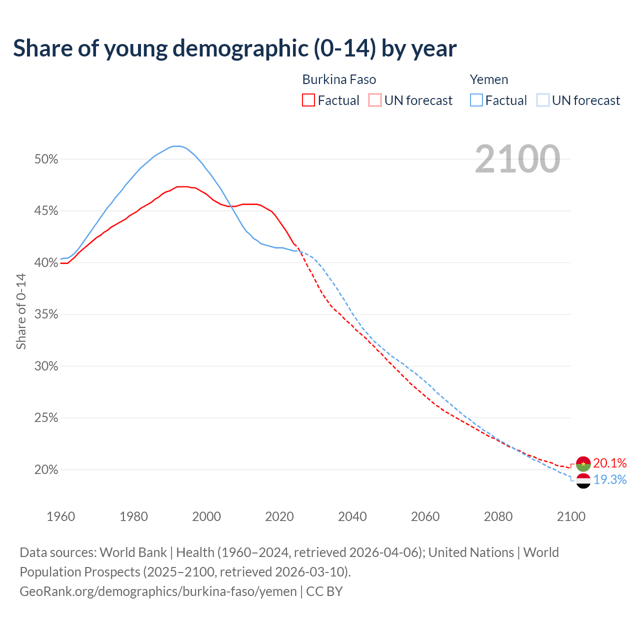 - The share of young demographic (0-15 years old) in Burkina Faso is 41.8% vs 41.1% in Yemen.