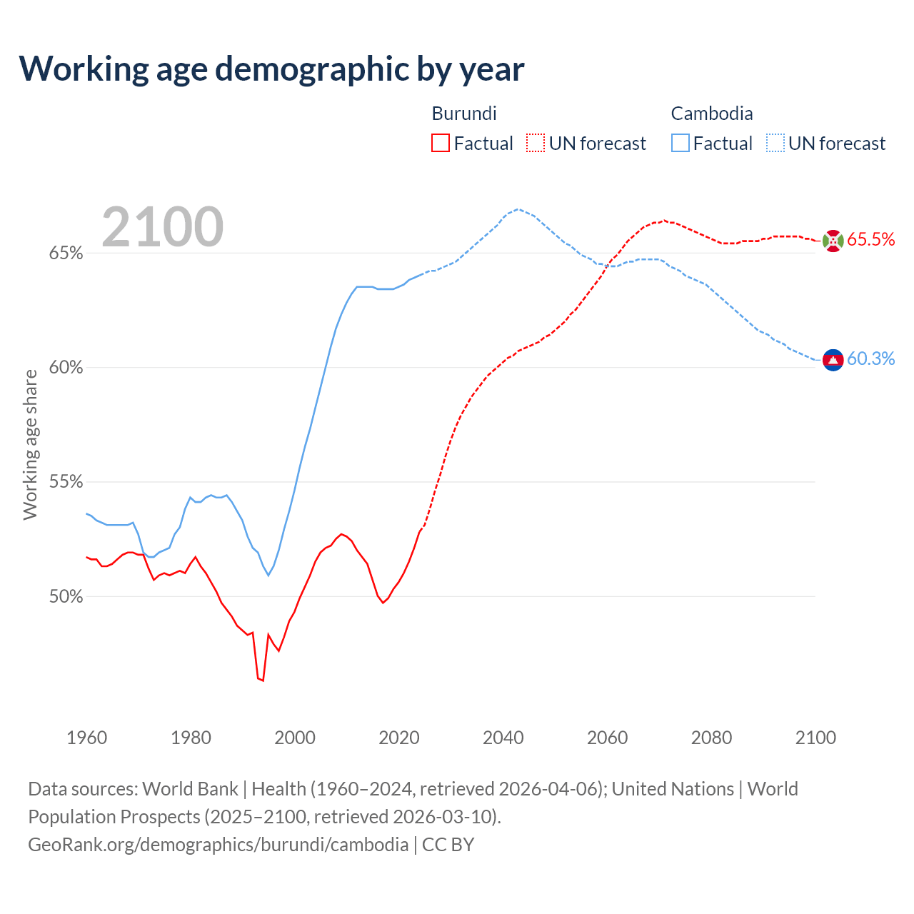 The share of older people aged 65 and over is 2.53% in Burundi and 6.16% in Cambodia. Life expectancy in Burundi compared to Cambodia .