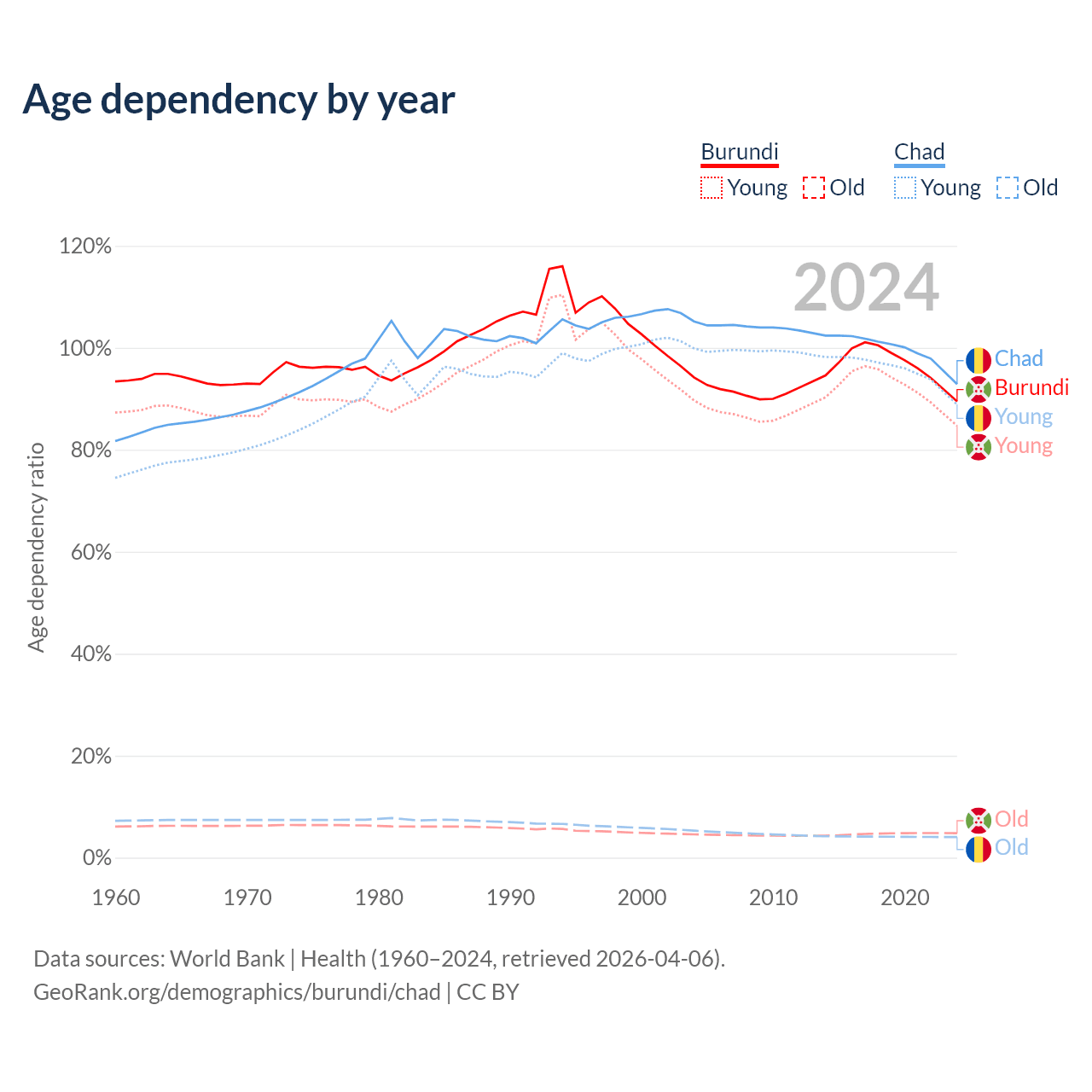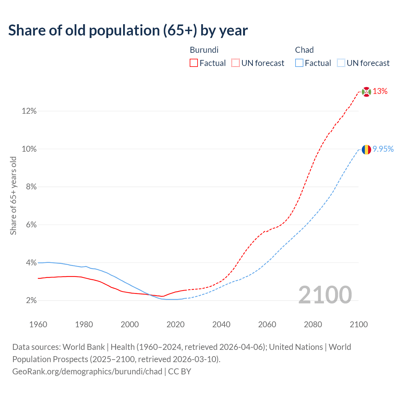 - The share of old-age demographic (65+) in Burundi is 2.53% vs 2.1% in Chad.