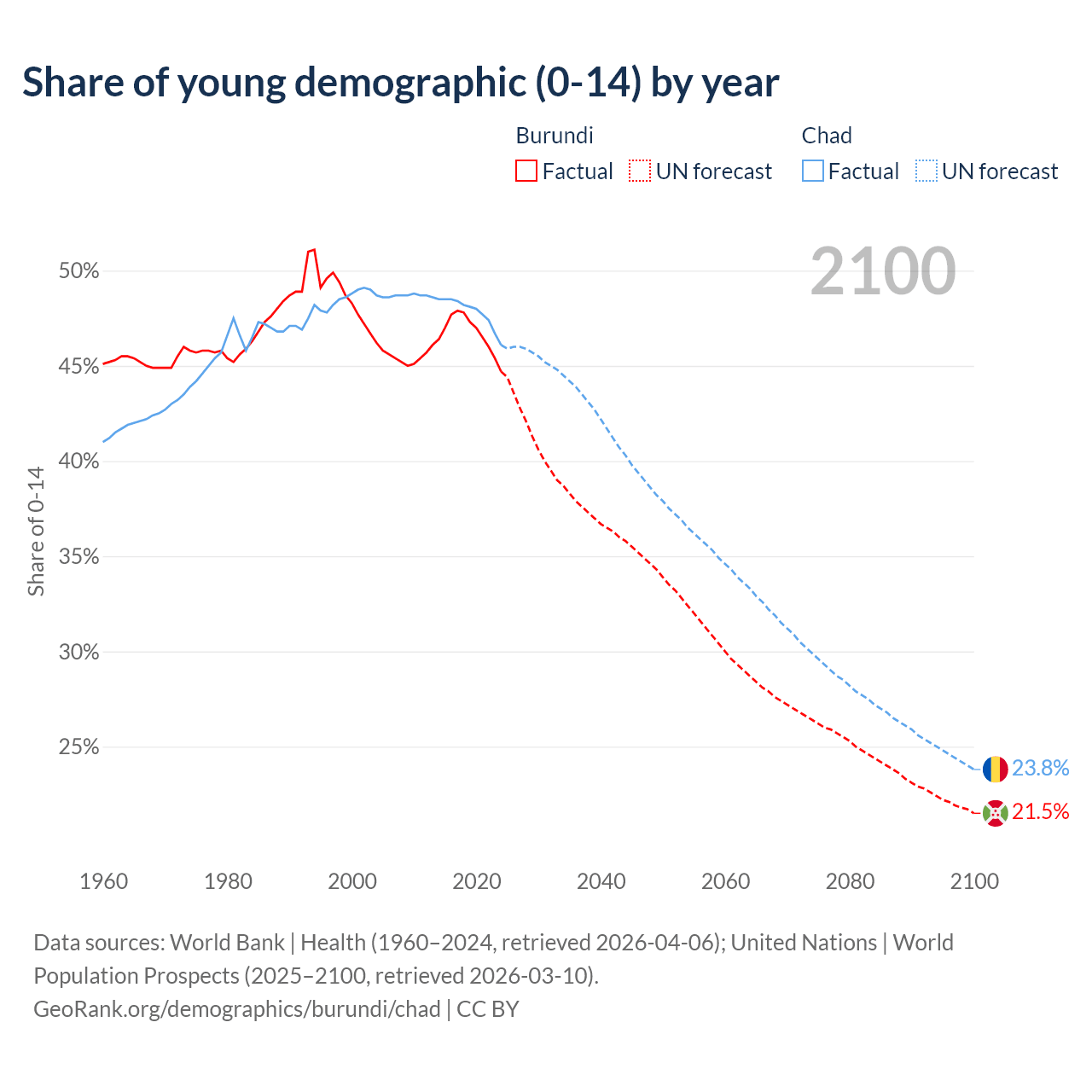 - The share of young demographic (0-15 years old) in Burundi is 44.7% vs 46.1% in Chad.